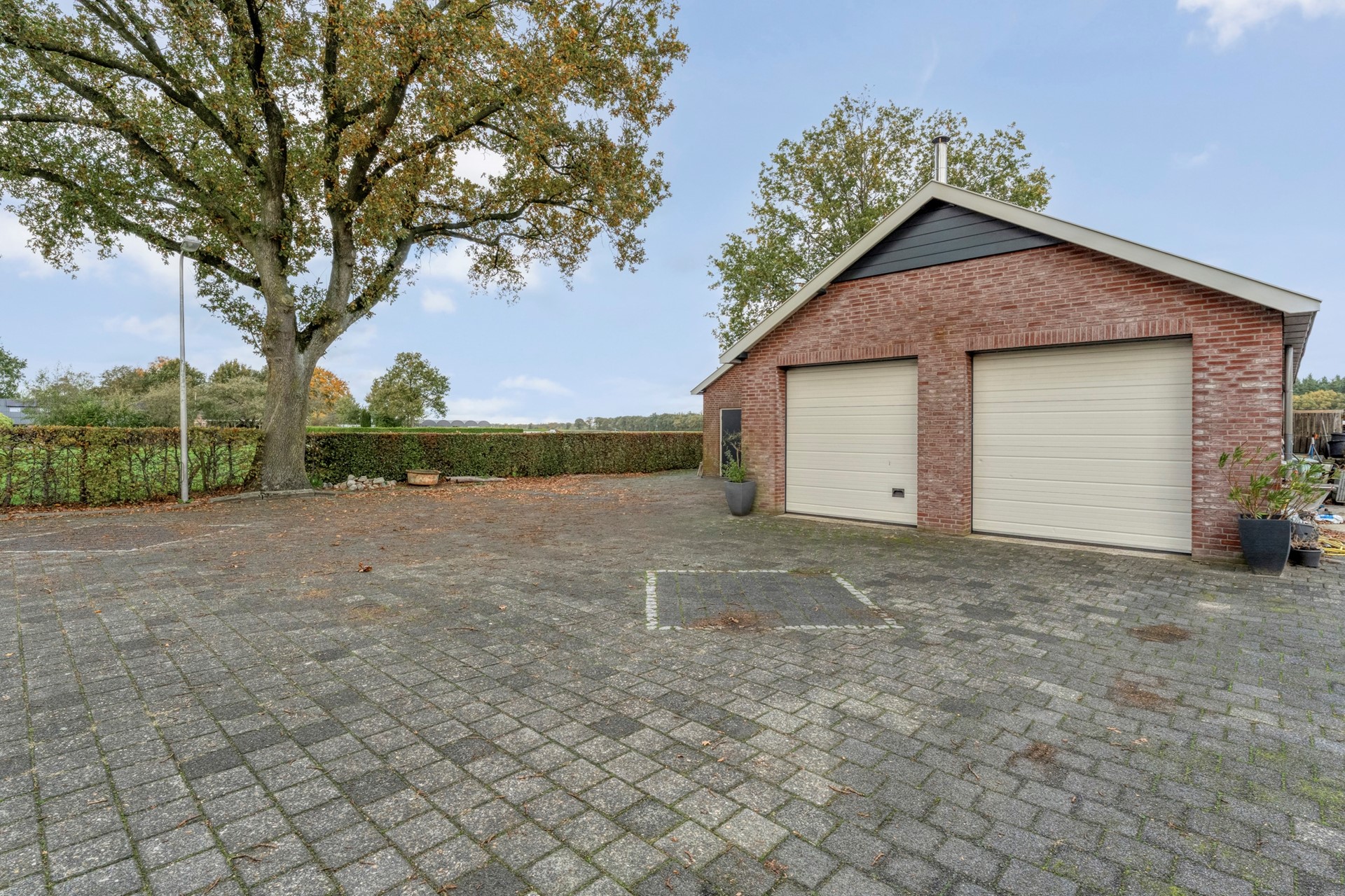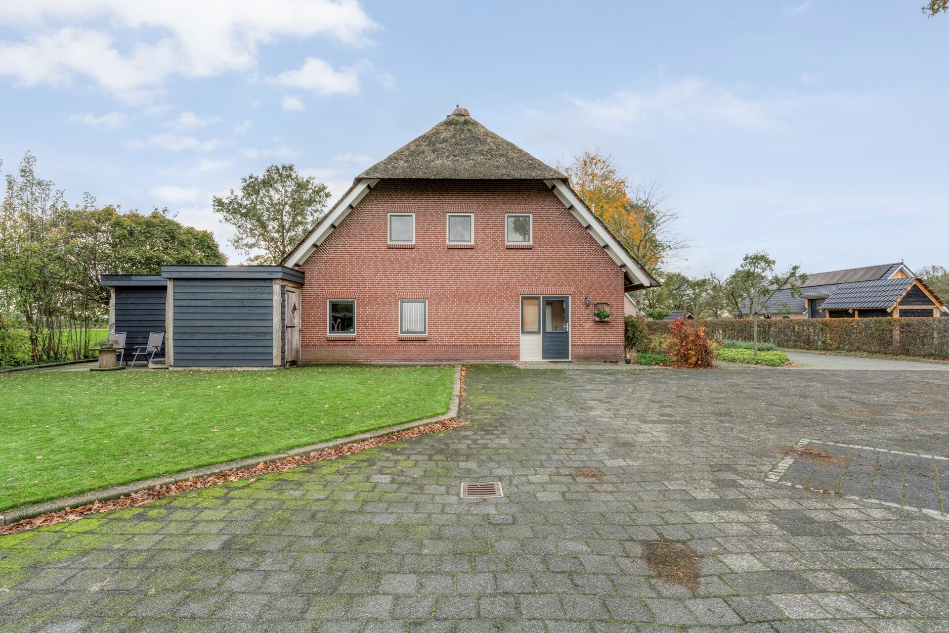 Een lange oprijlaan leidt naar een sfeervolle, praktische buitenruimte met meerdere parkeerplaatsen, tuin, opslag en een bijzonder grote hal/buitenberging met aangebouwde stenen garage.