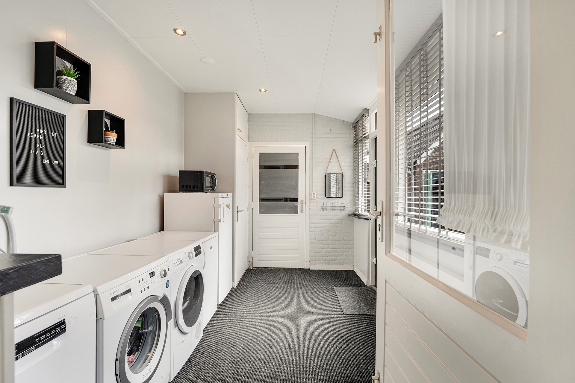 Aan de achterzijde van de woning bevinden zich de bijkeuken met wasmachine-aansluitingen, c.v. installatie (Intergas HR, 2017) en voorraadkast.