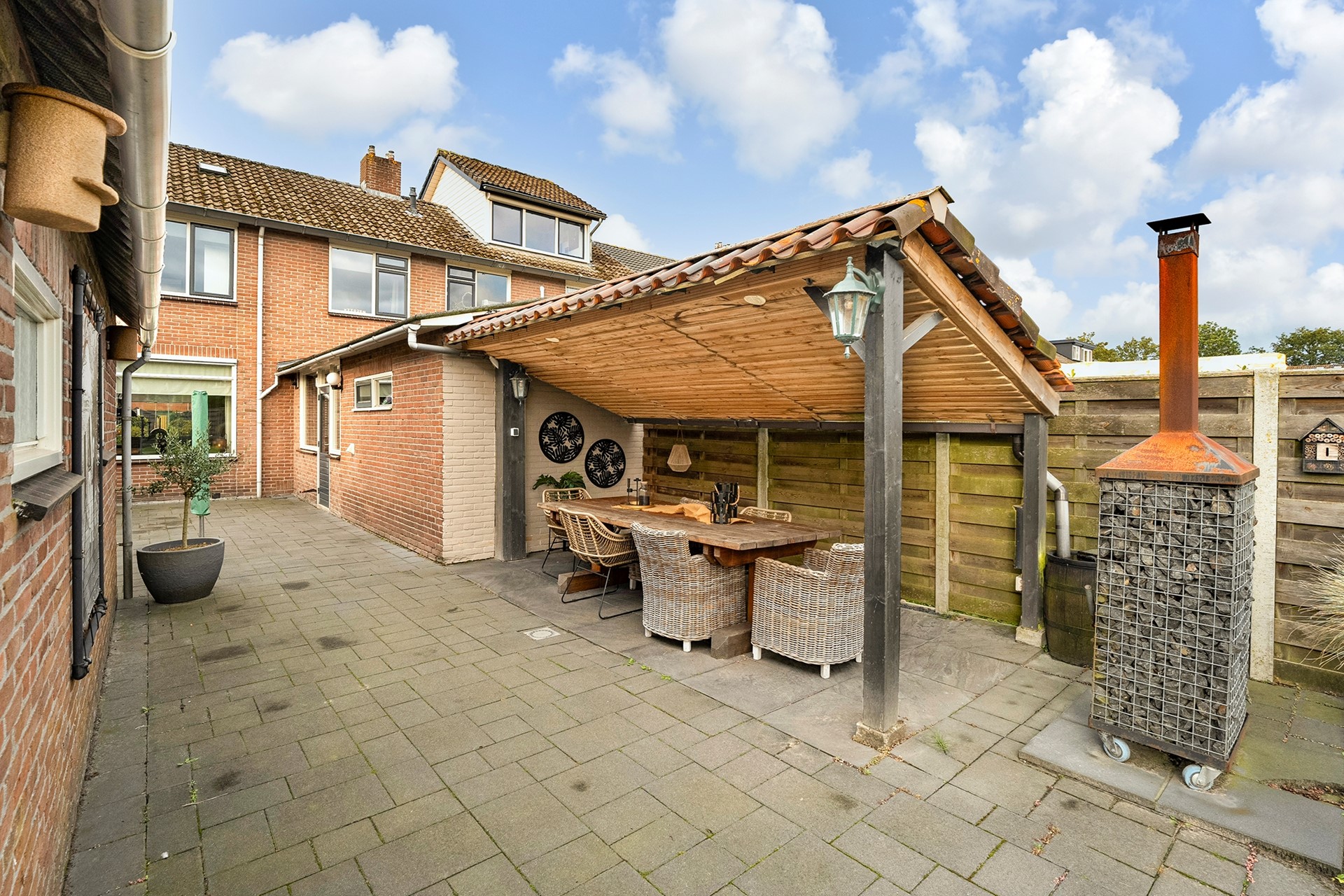 Bijzonder diep bemeten achtertuin (perceel 401m²) met verschillende terrassen, overkapping en vrijstaande garage (7x4) met vliering.