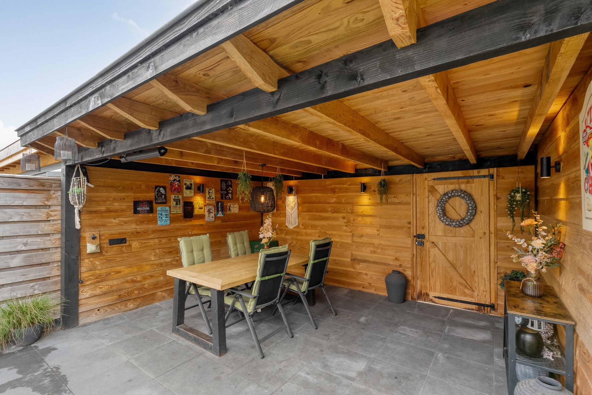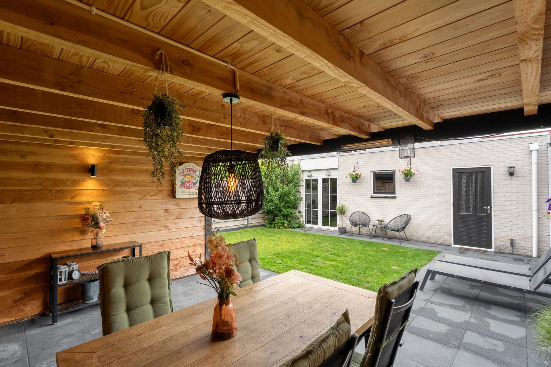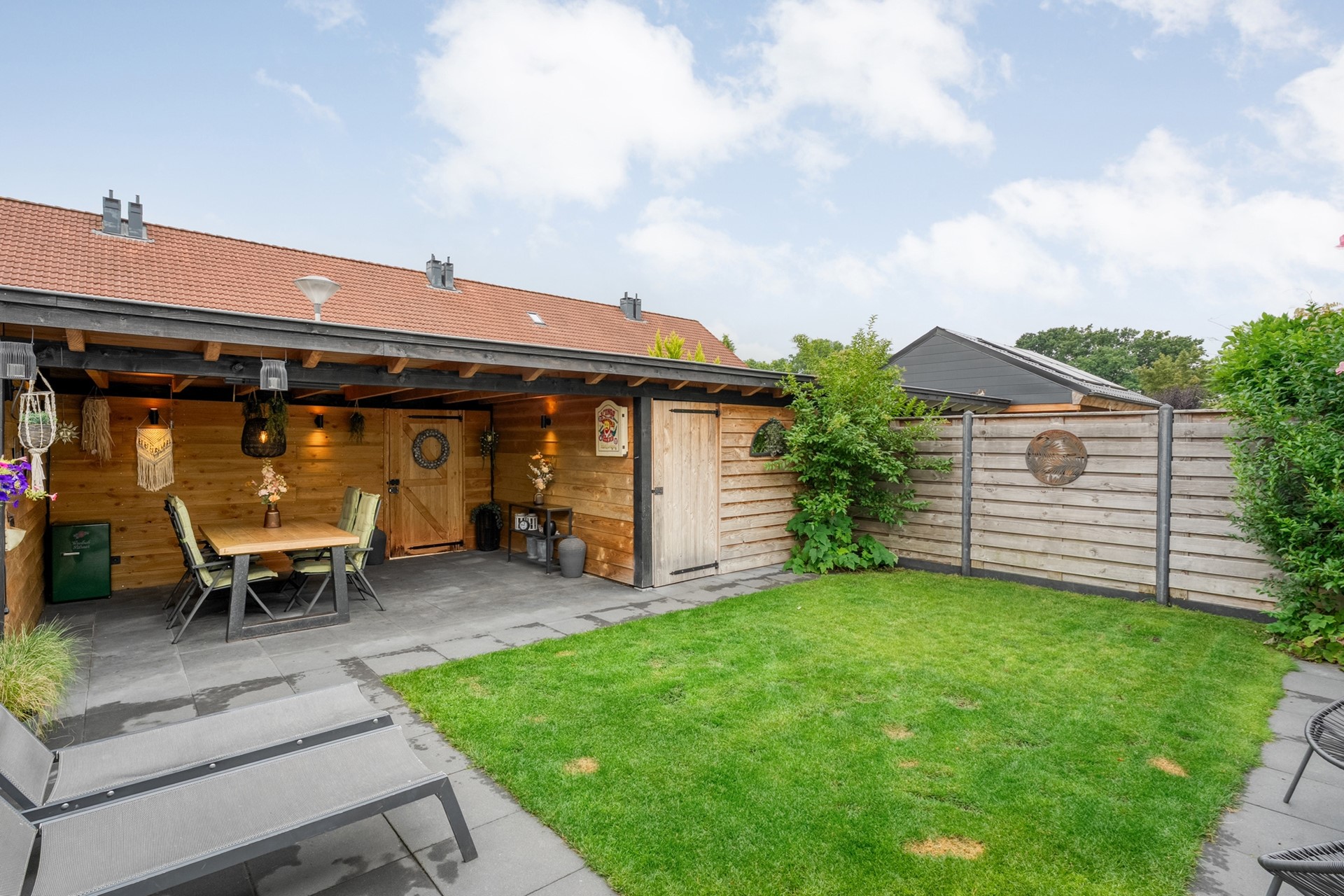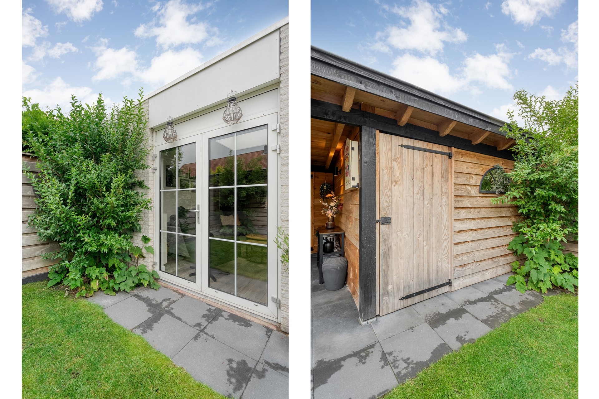 Achter in de tuin vind je nog een knusse houten schuur, afgewerkt met een gezellige overkapping. Wat een heerlijke plek om tot in de late uurtjes te borrelen. Iets verderop de aangebouwde stenen garage en aparte berging – ideaal voor fietsen, klusspullen, tuinmeubels en eigenlijk al het andere wat je liever uit het zicht hebt. Alles netjes op z’n plek, altijd.