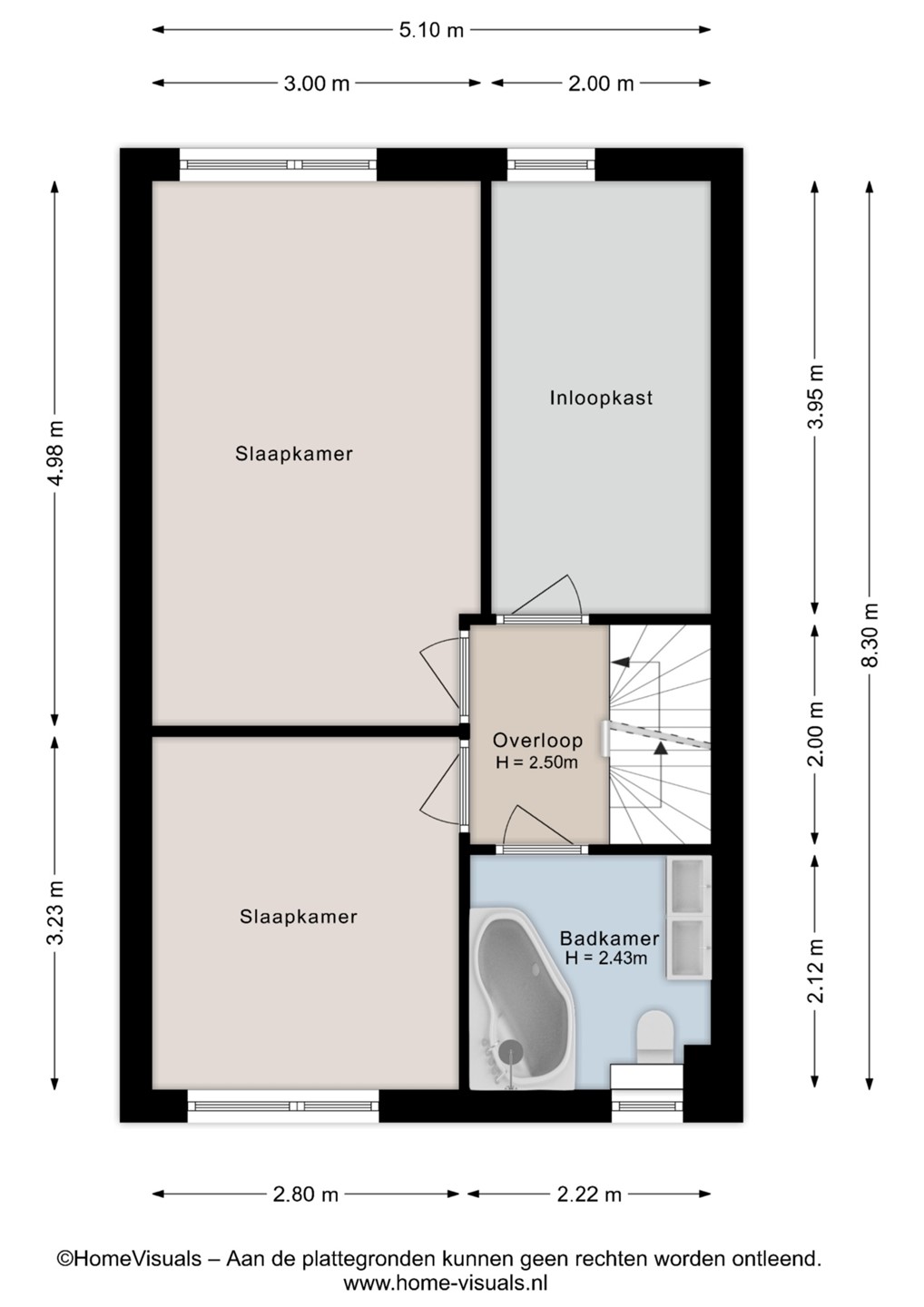 Overloop, drie slaapkamers en keurige badkamer v.v. ligbad, wastafelmeubel, toilet en designradiator.