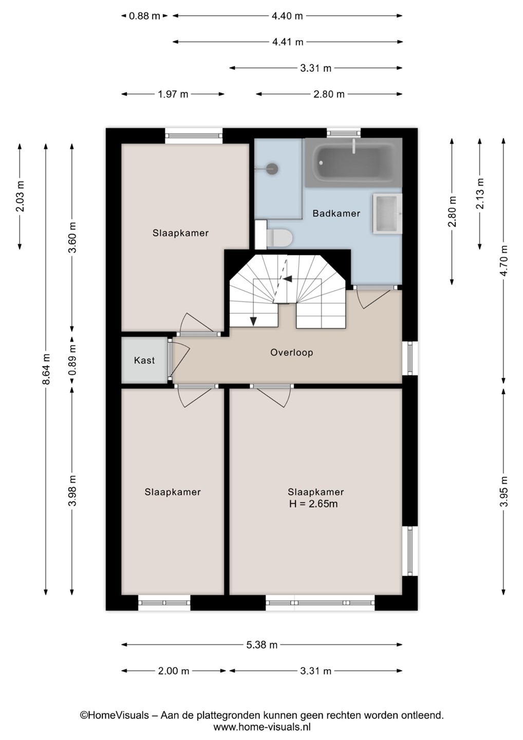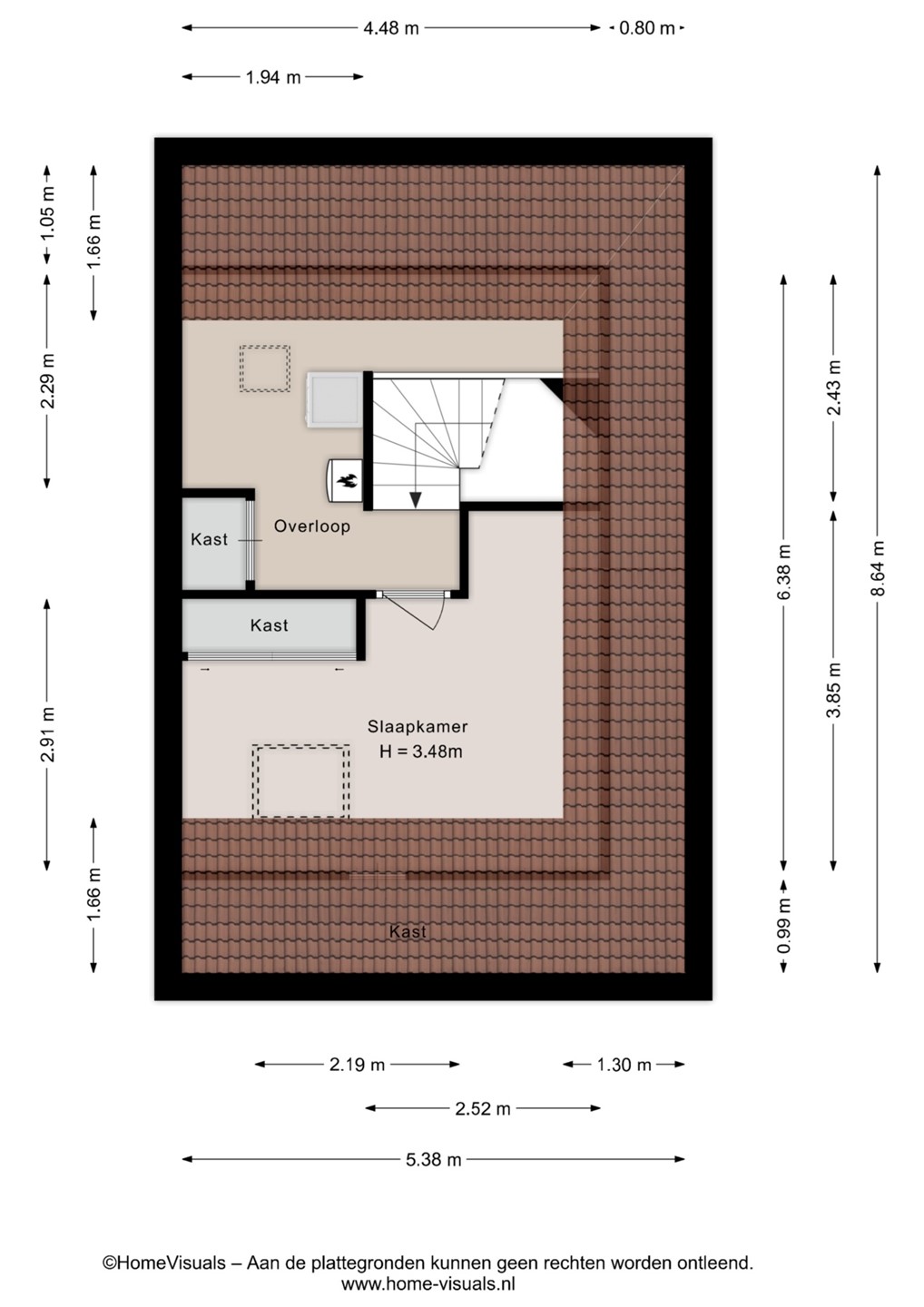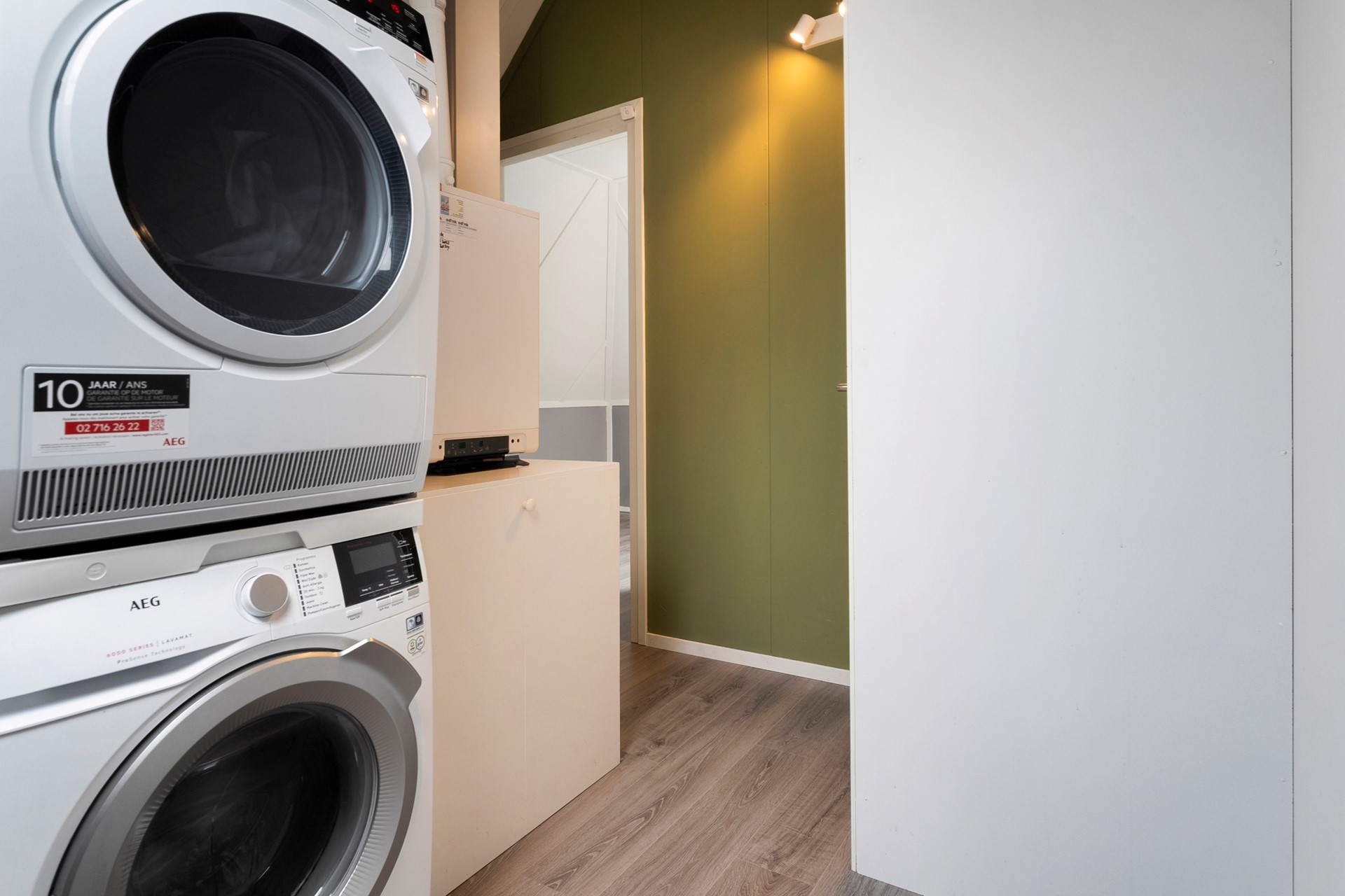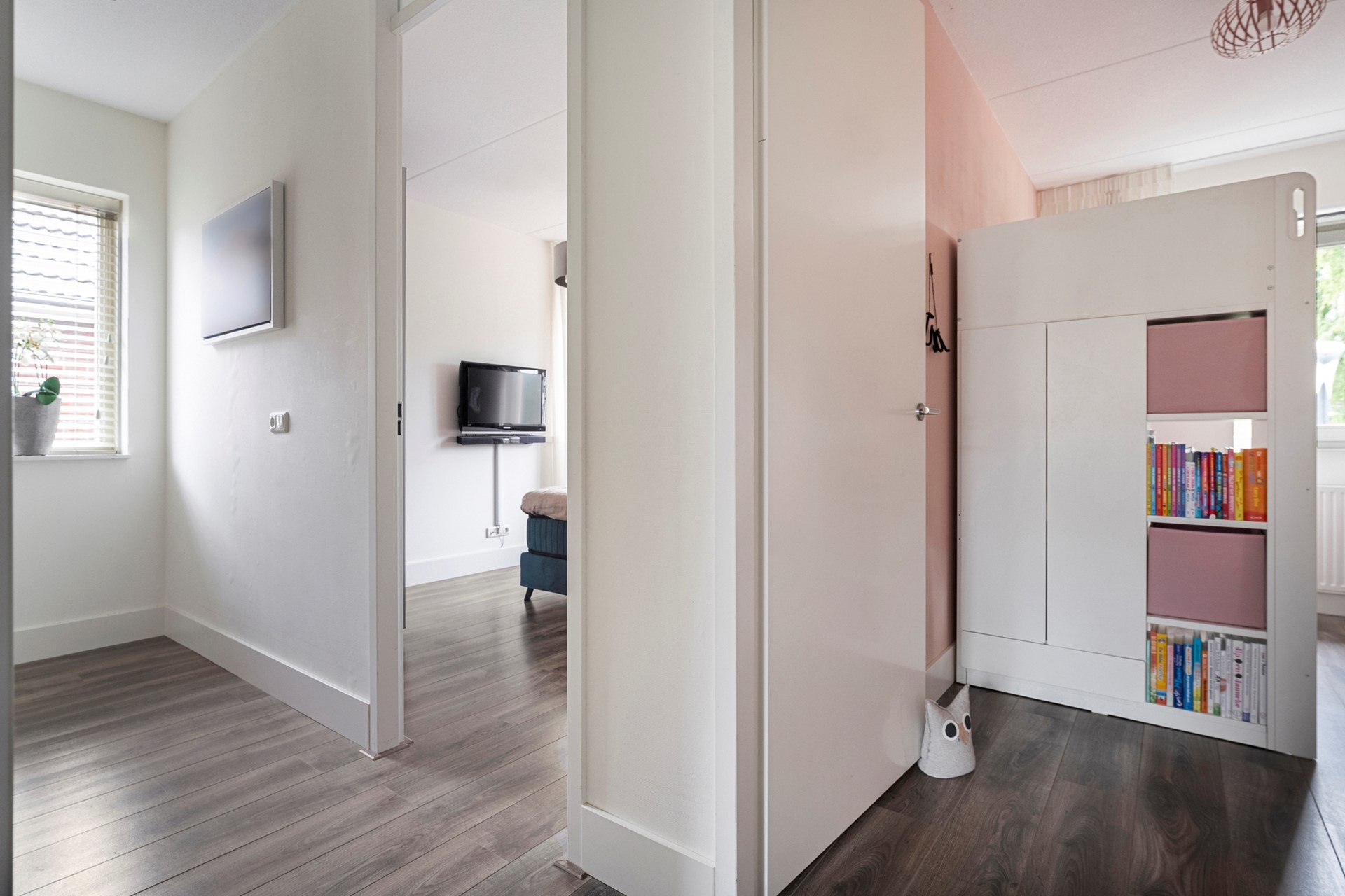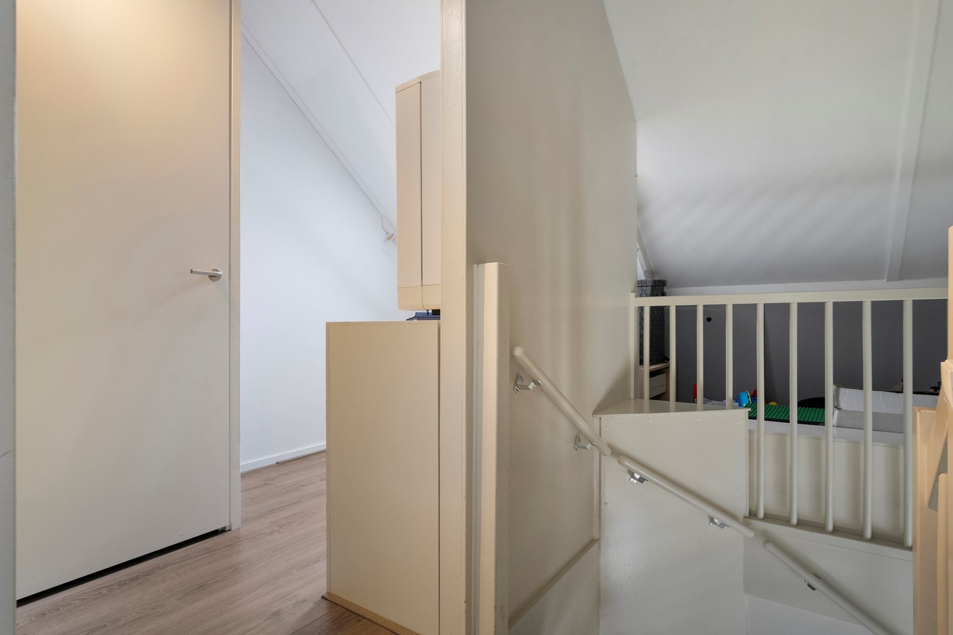 Overloop, één slaapkamer met vaste kastenwand, aansluitingen voor wasmachine en droger, vaste kast, omvormer en c.v. installatie Intergas HR uit 2012.
