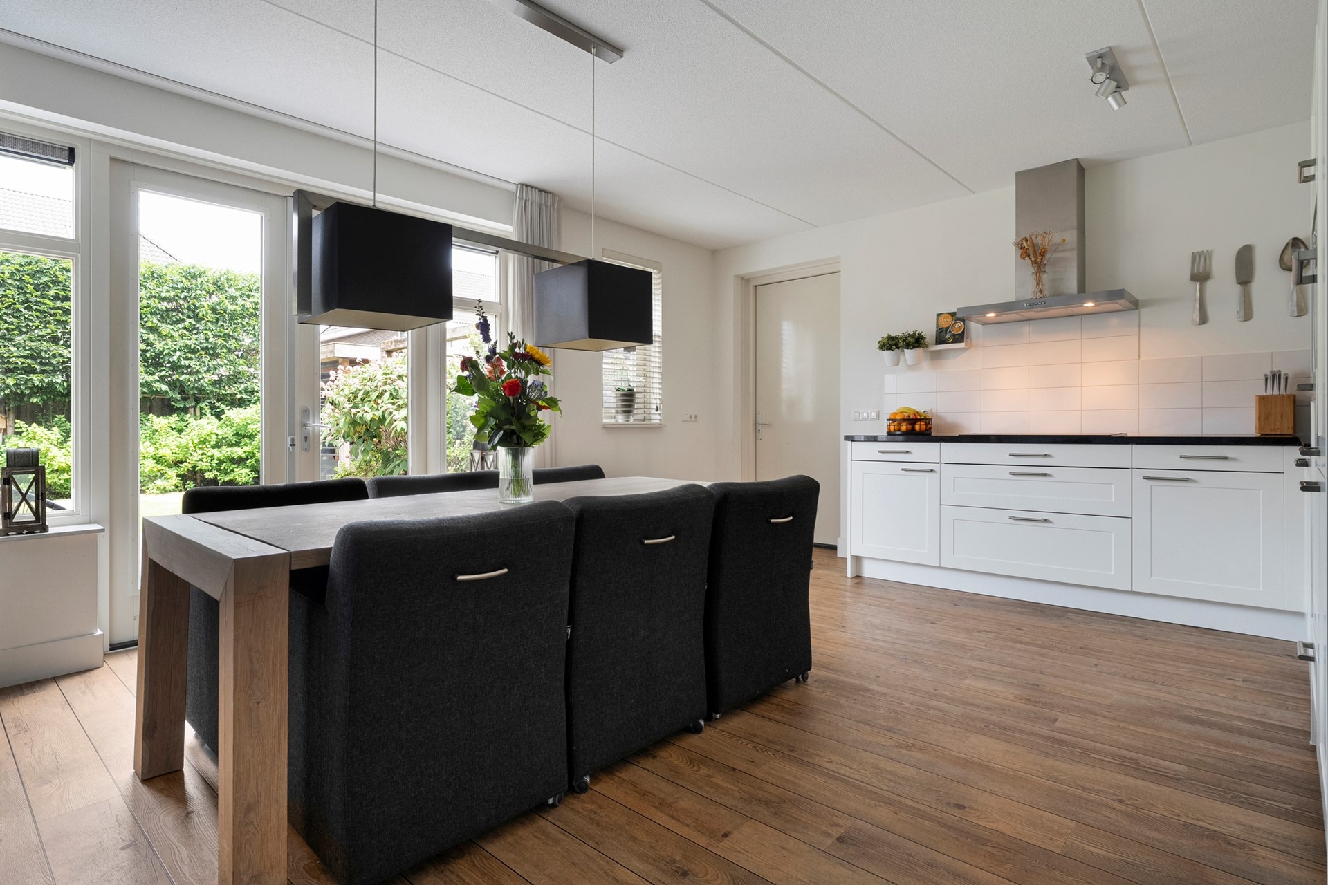 De woonkamer is straatgericht en kijkt prettig weg aan de voorzijde met veel ruimte. Aan de achterzijde is de woonkeuken gesitueerd met verschillende inbouwapparatuur alsmede de openslaande tuindeuren naar de sfeervolle achtertuin met overkapping. Via een binnendeur verkrijgt u toegang tot de aangebouwde stenen garage met loopdeur.