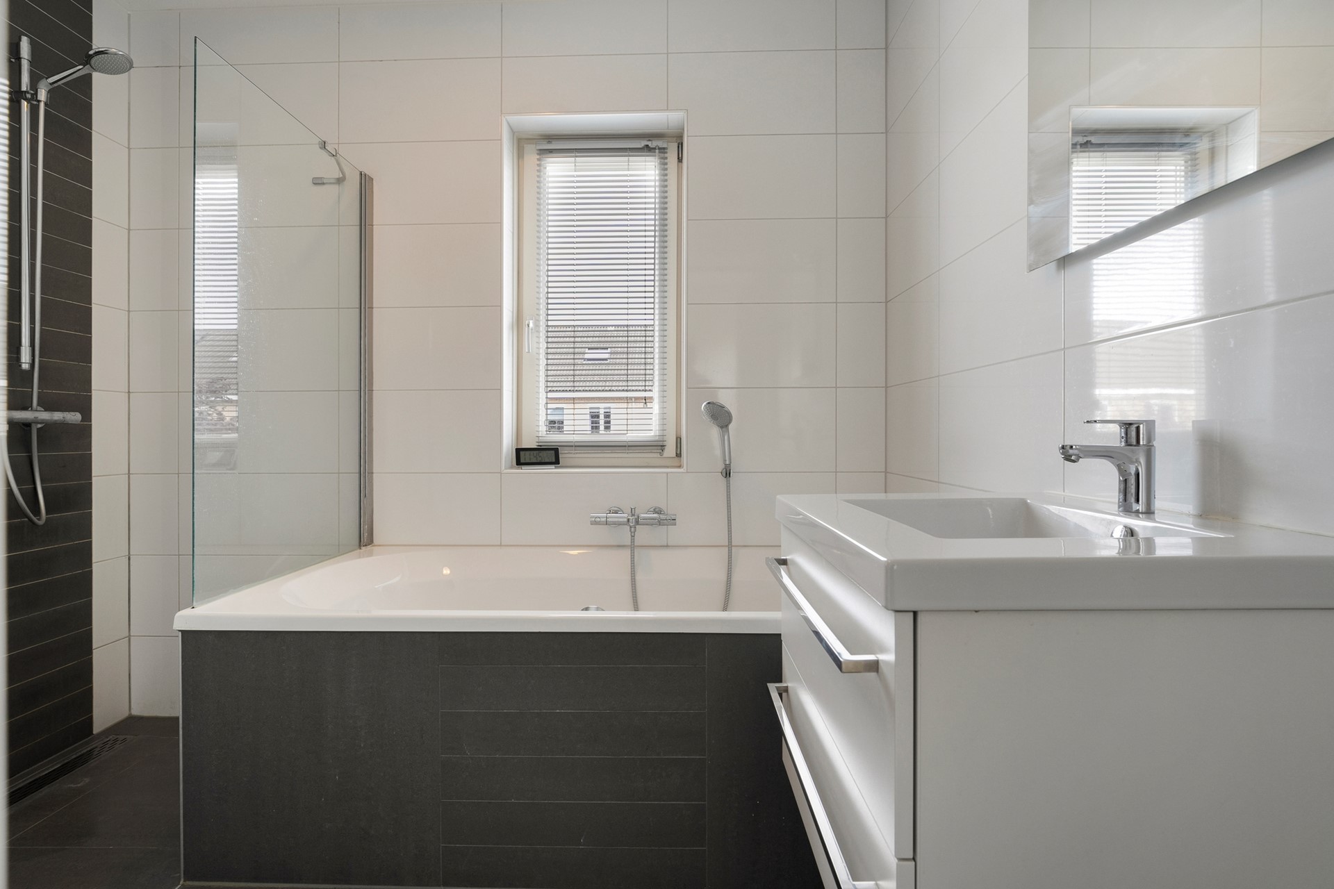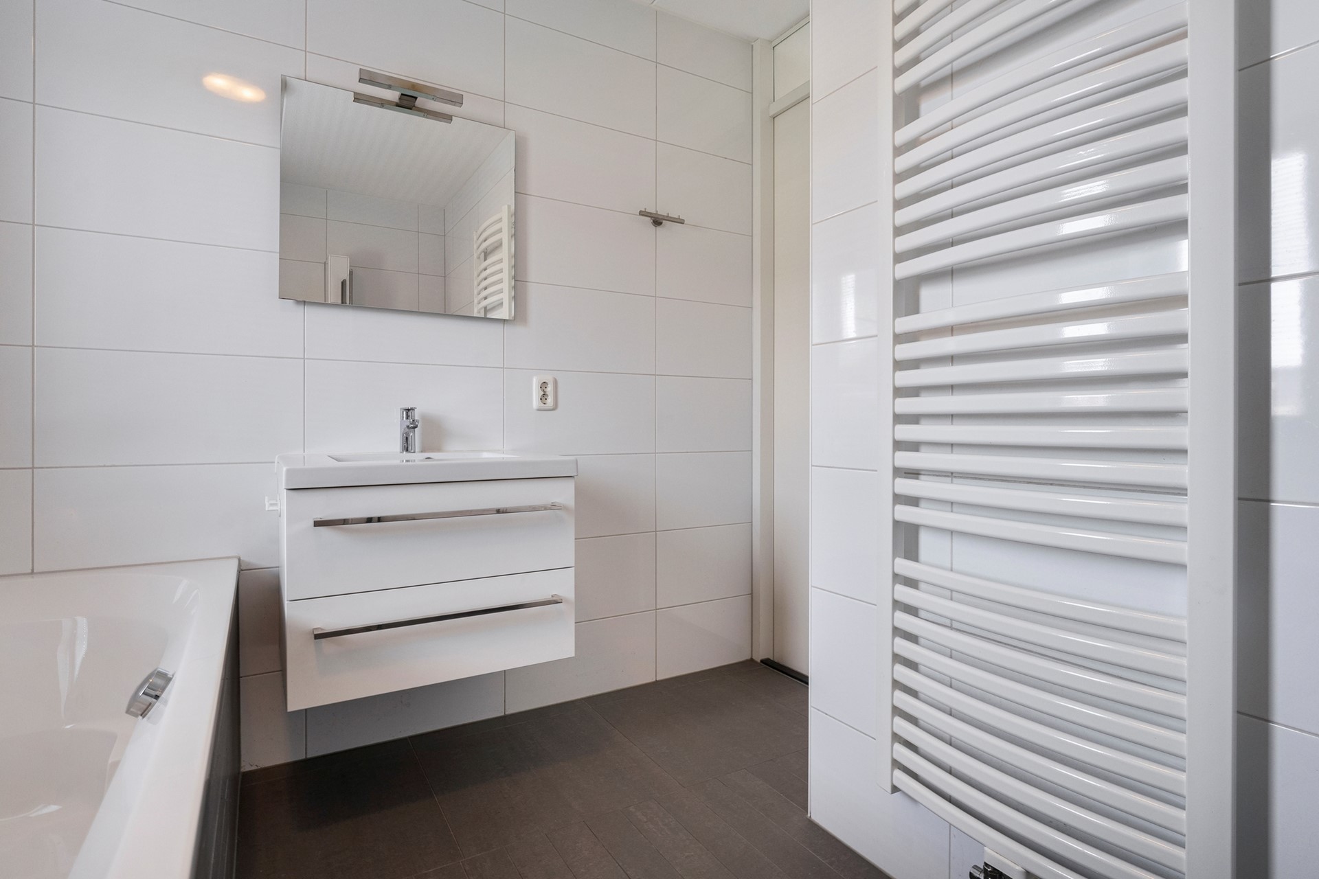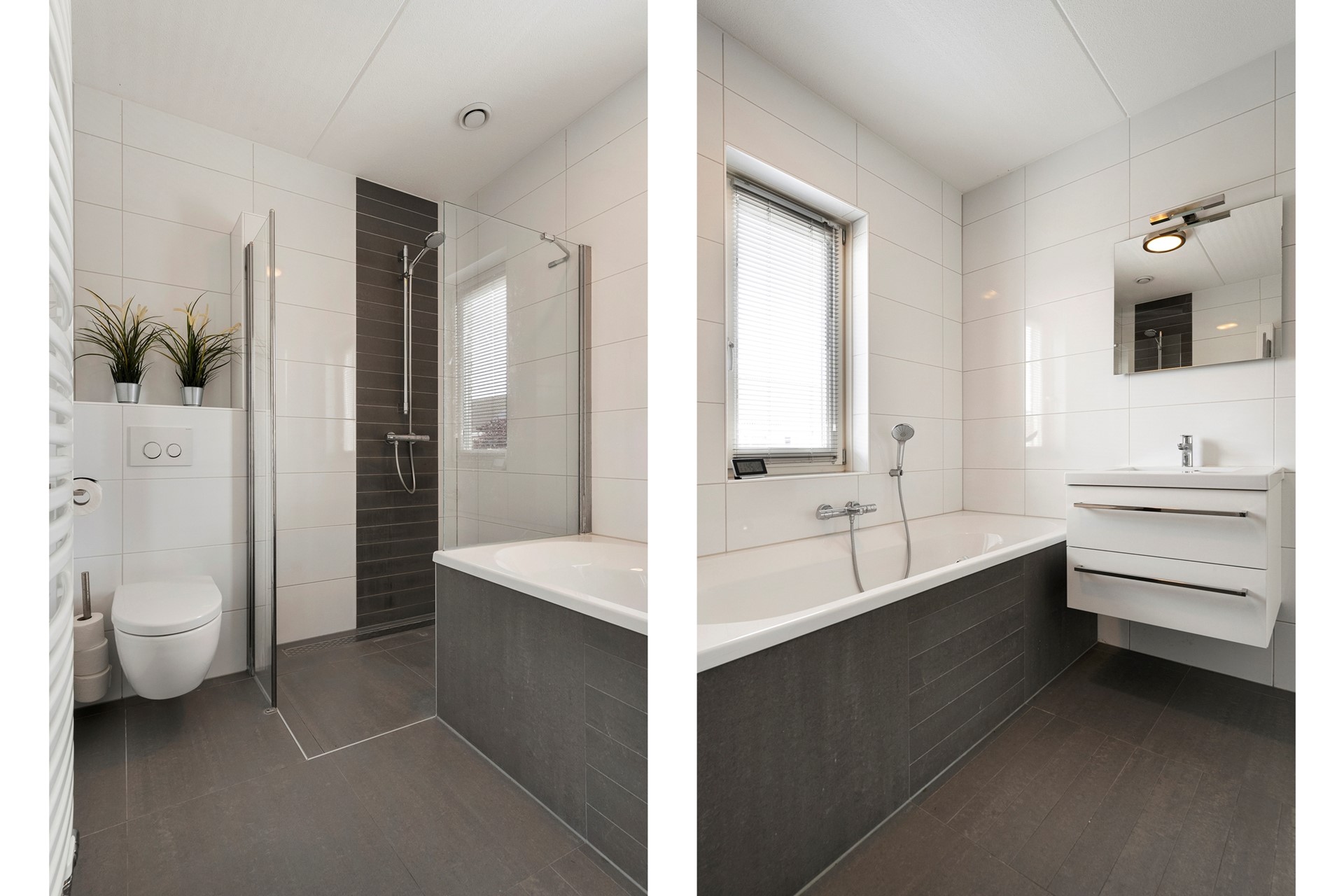 Overloop met inloopkast, drie slaapkamers en badkamer, uitgevoerd met toilet, inloopdouche, ligbad, wastafelmeubel en designradiator.
