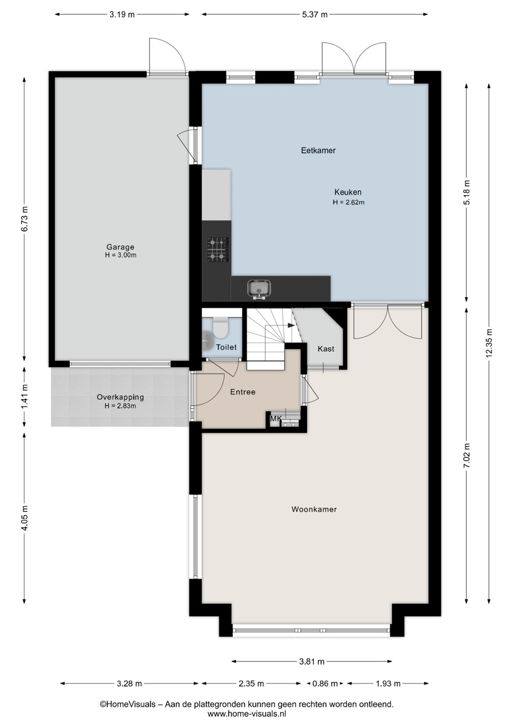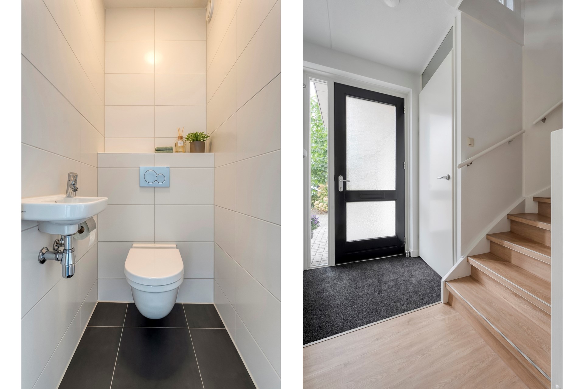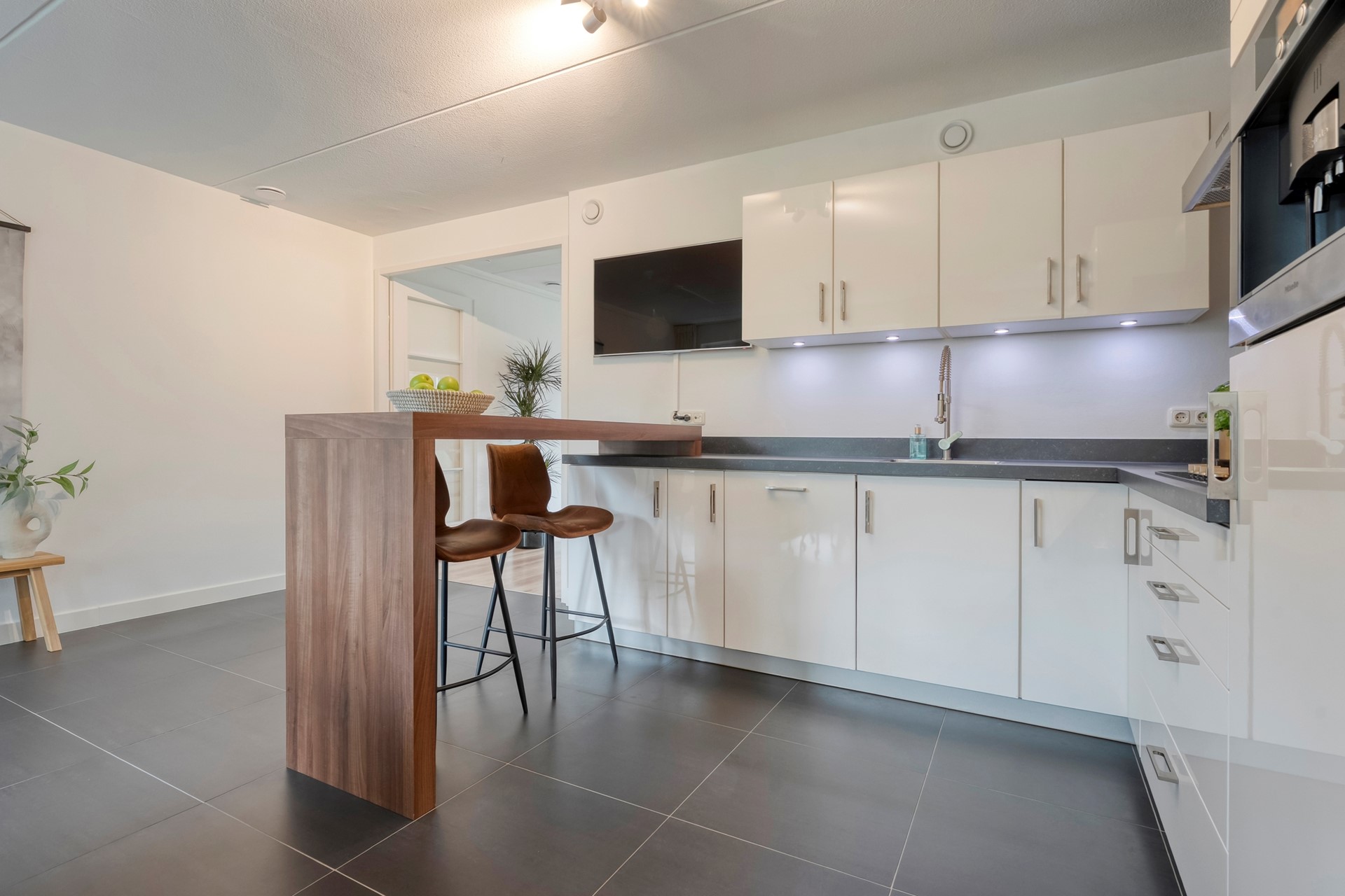 Middels overdekt entree betreedt men de hal met trapopgang, meterkast en toilet met fonteintje. Aan de voorzijde van de woning is de speelse, ruim opgezette woonkamer met grote raampartijen . Aan de achterzijde daarentegen een uitgebouwde woonkeuken met verschillende inbouwapparatuur. Zo kent deze keuken een koelkast, vriezer, inbouwkoffiezetapparaat, vaatwasser, combimagnetron en 4 -pits gaskookplaat met afzuigkap. De keuken kent eveneens een gezellige barindeling.