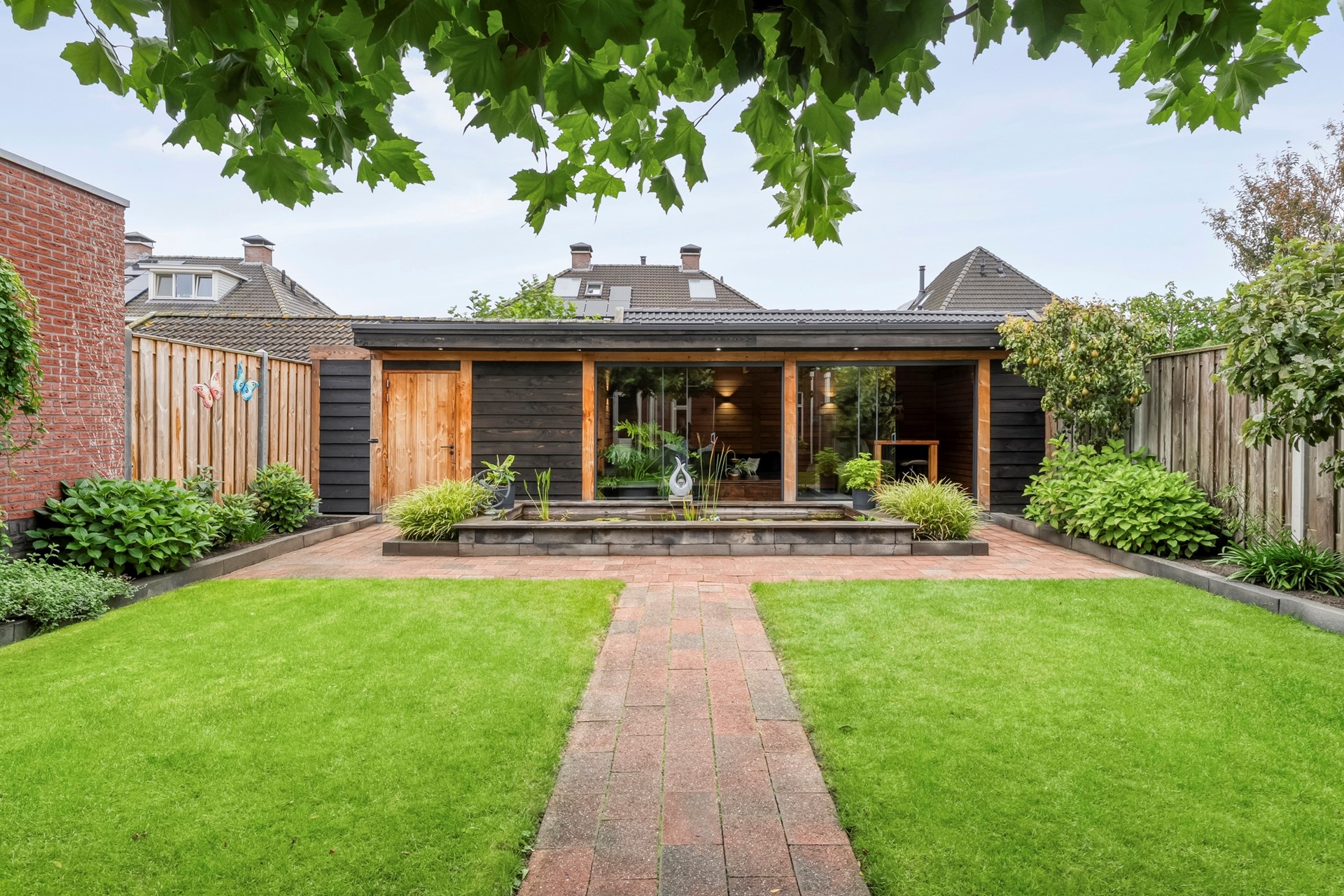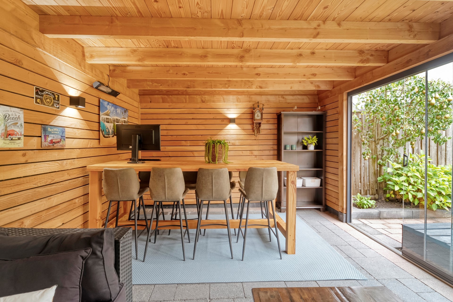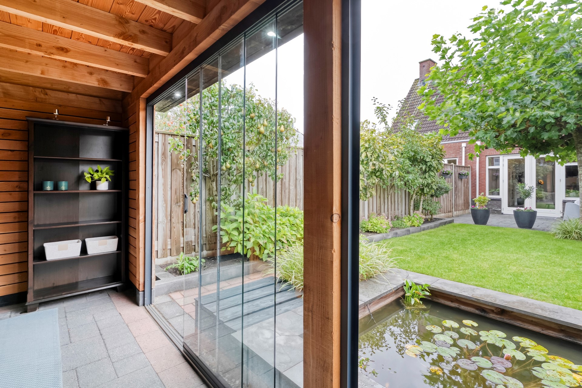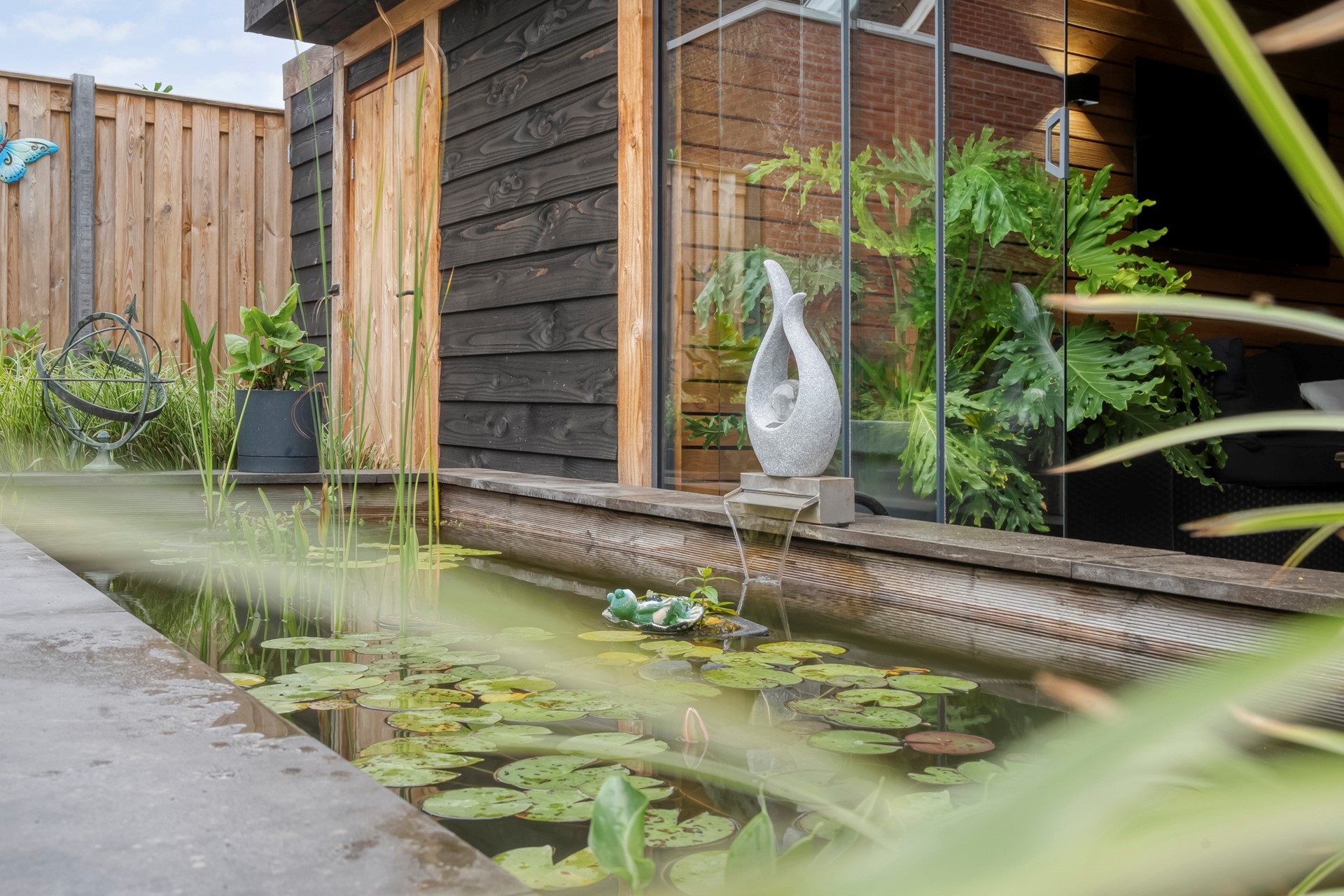 Ook buiten is het puur genieten. Aan de achterkant wacht een diepe tuin (bijna 20 meter diep) vol privacy, waar je je eigen groene paradijs hebt. Of gewoon neerstrijken in de luxe en tevens geïsoleerde tuinkamer . Lekker onder het dak met een koffie, glaasje wijn of goed boek – ongeacht het weer zit je hier altijd (letterlijk én figuurlijk) goed. Even uitpuffen doe je terwijl je luistert naar het gekabbel van de vijverpartij. Je fiets of hobbyspullen kwijt? Precies: daarvoor is de geïsoleerde, houten berging perfect.