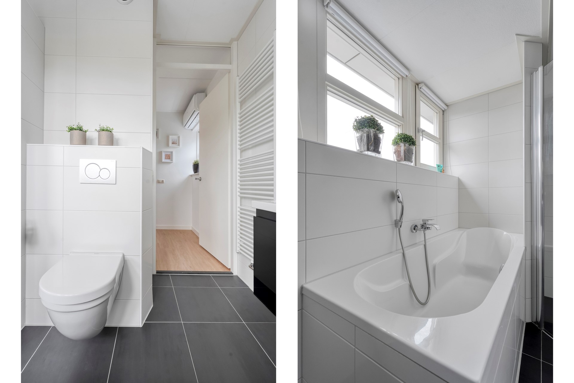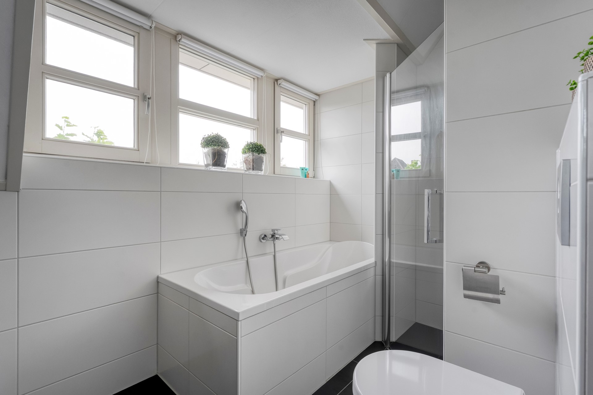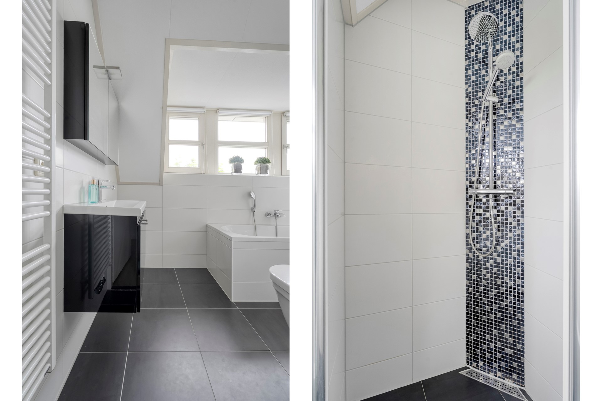 Overloop, drie slaapkamers en aan de achterzijde een eigentijdse badkamer , uitgevoerd met dakkapel en o.a. ligbad, inloopdouche, toilet en wastafelmeubel.