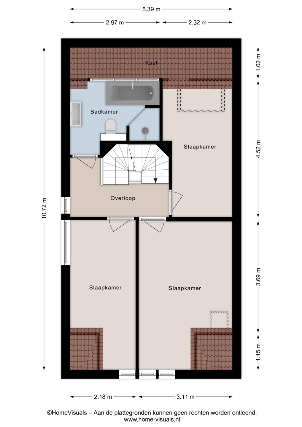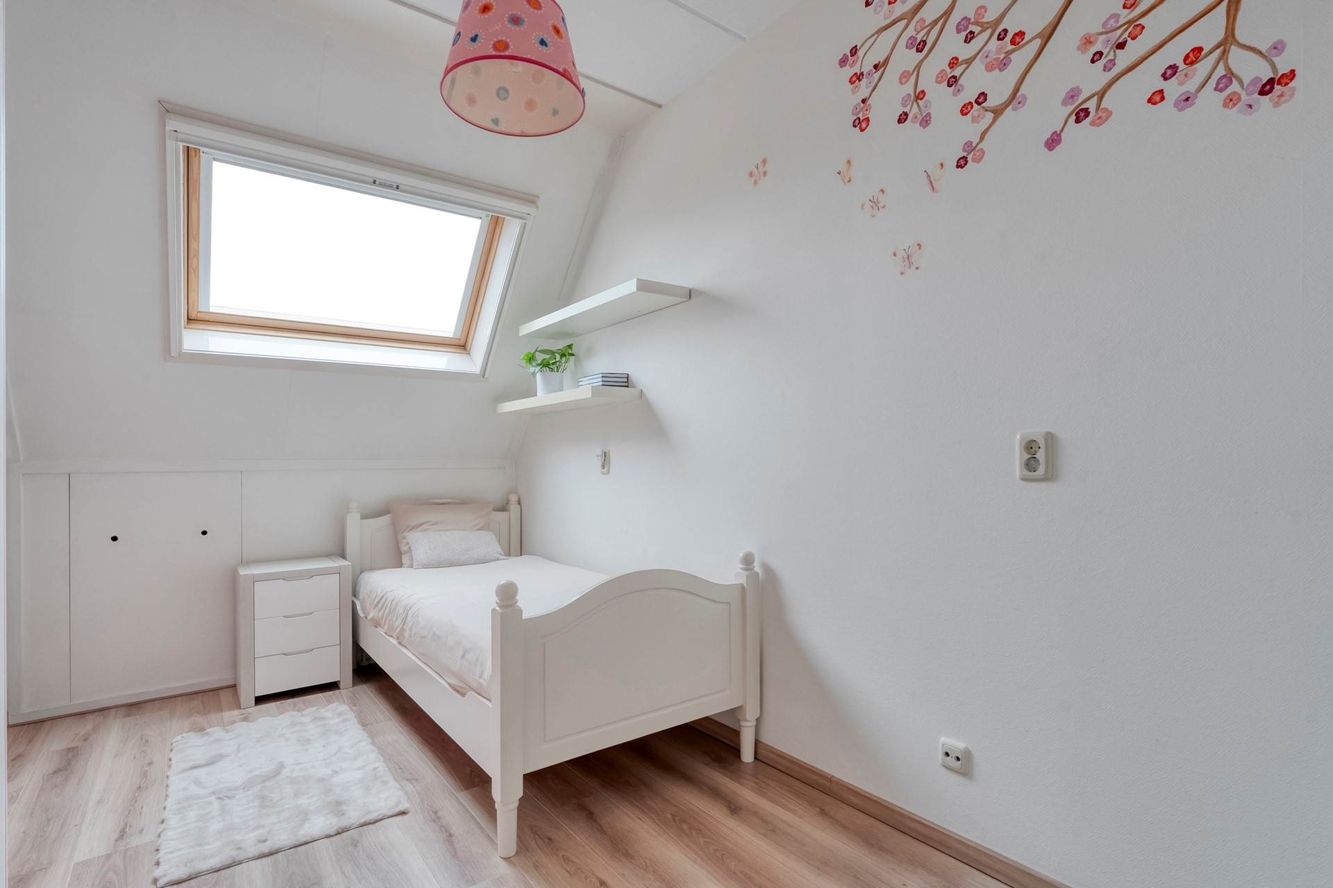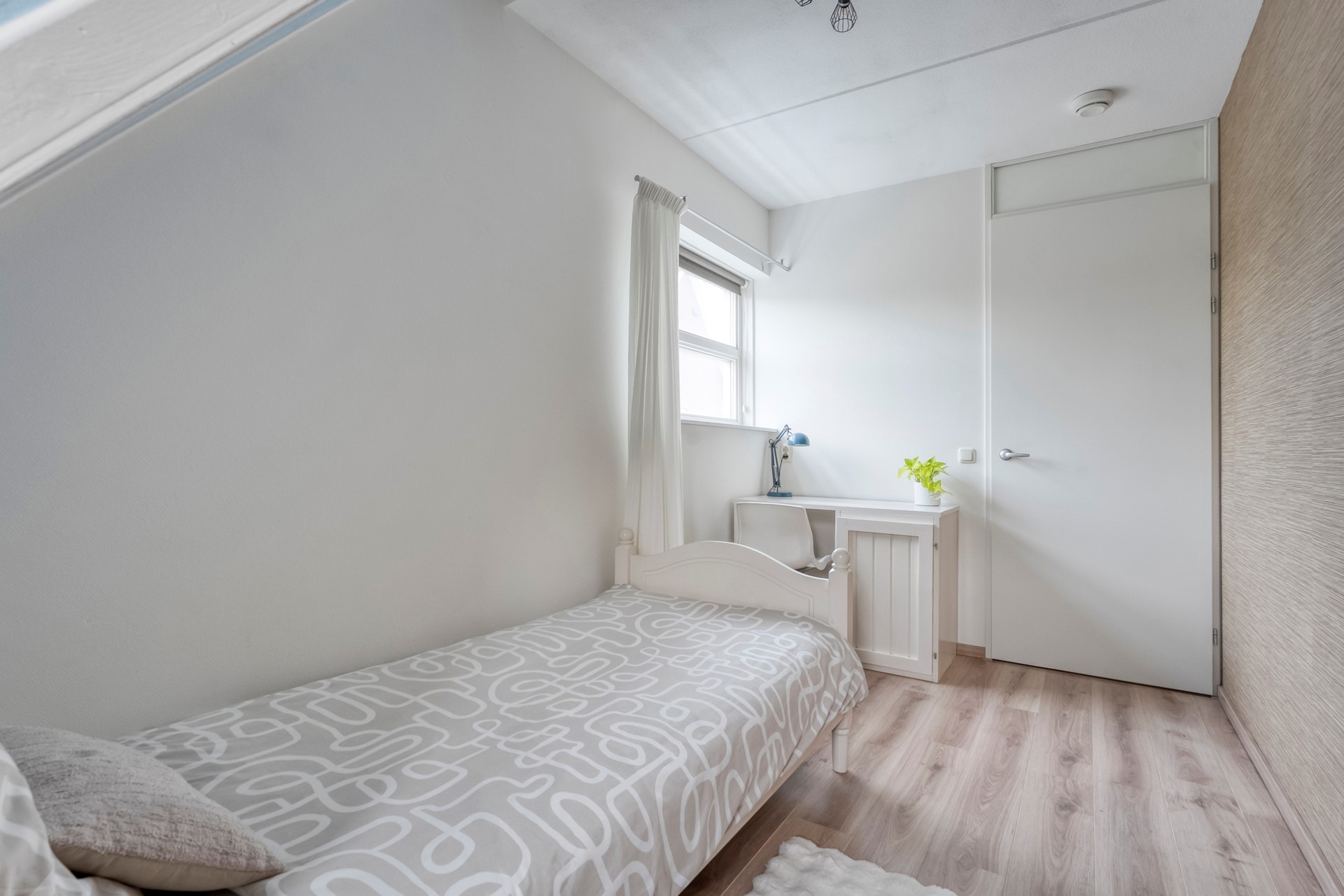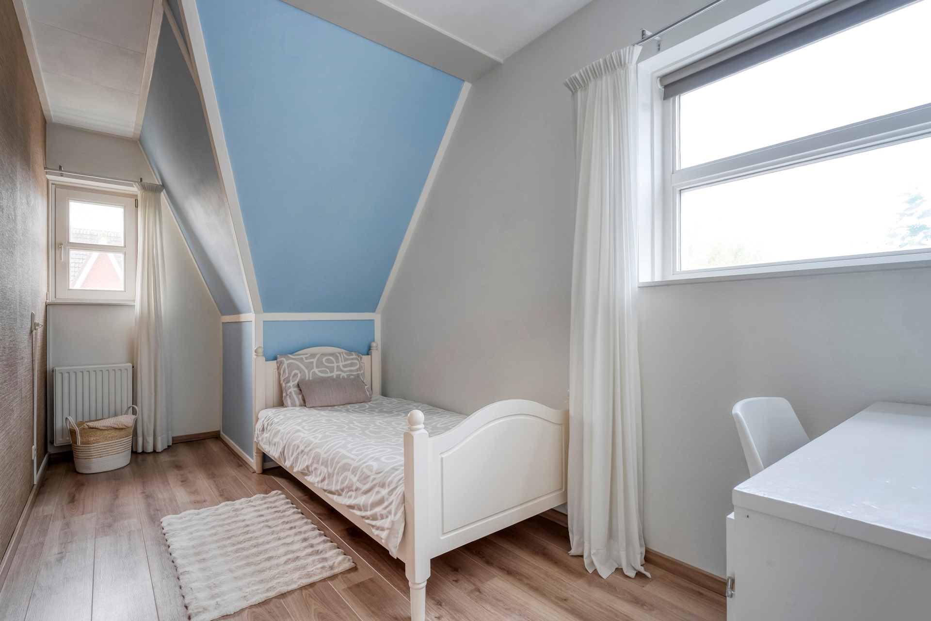 Overloop, drie slaapkamers en aan de achterzijde een eigentijdse badkamer , uitgevoerd met dakkapel en o.a. ligbad, inloopdouche, toilet en wastafelmeubel.