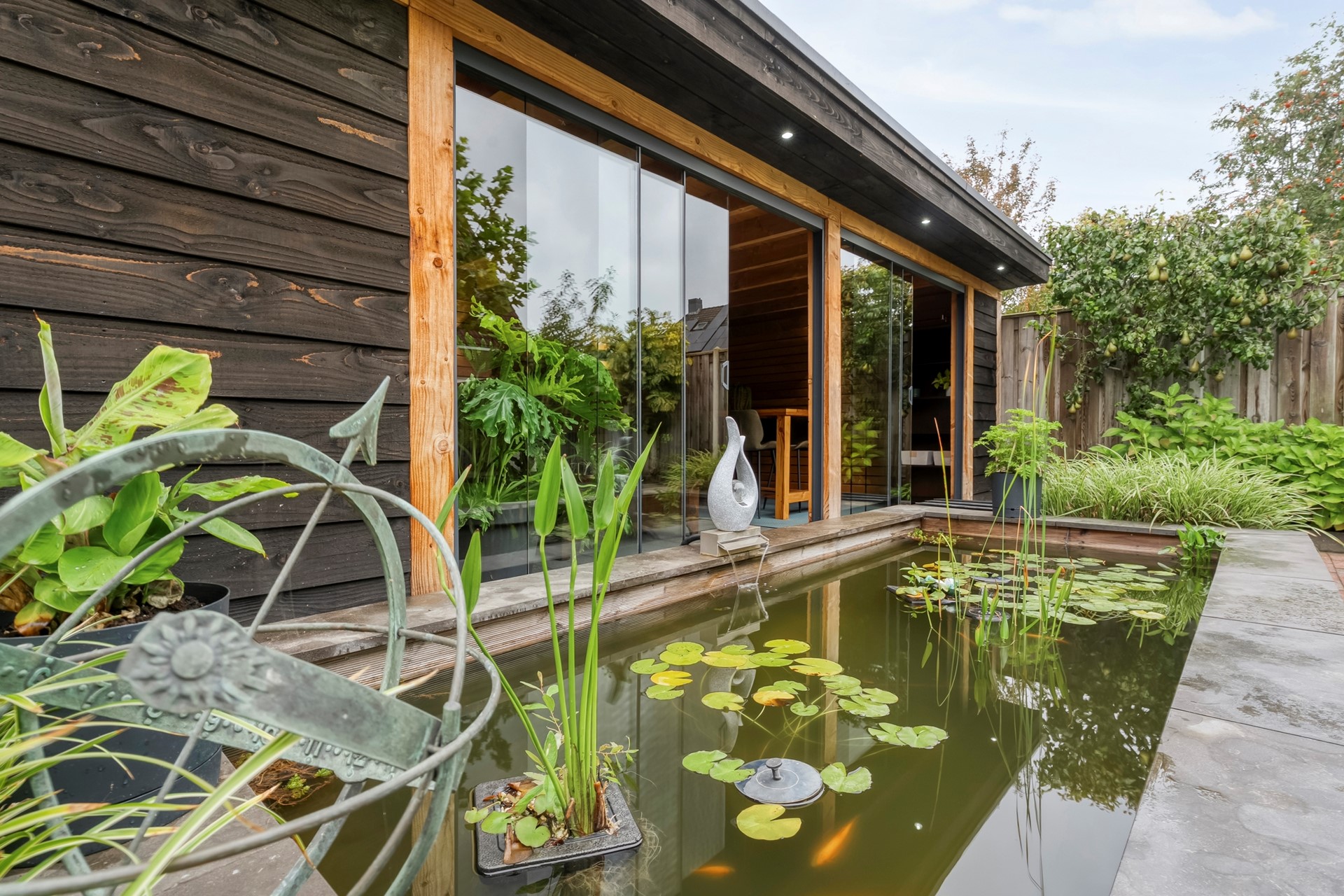 Openslaande tuindeuren geven toegang tot de diepe achtertuin met prachtige geïsoleerde buiten/tuinkamer met houten berging en een vijverpartij.