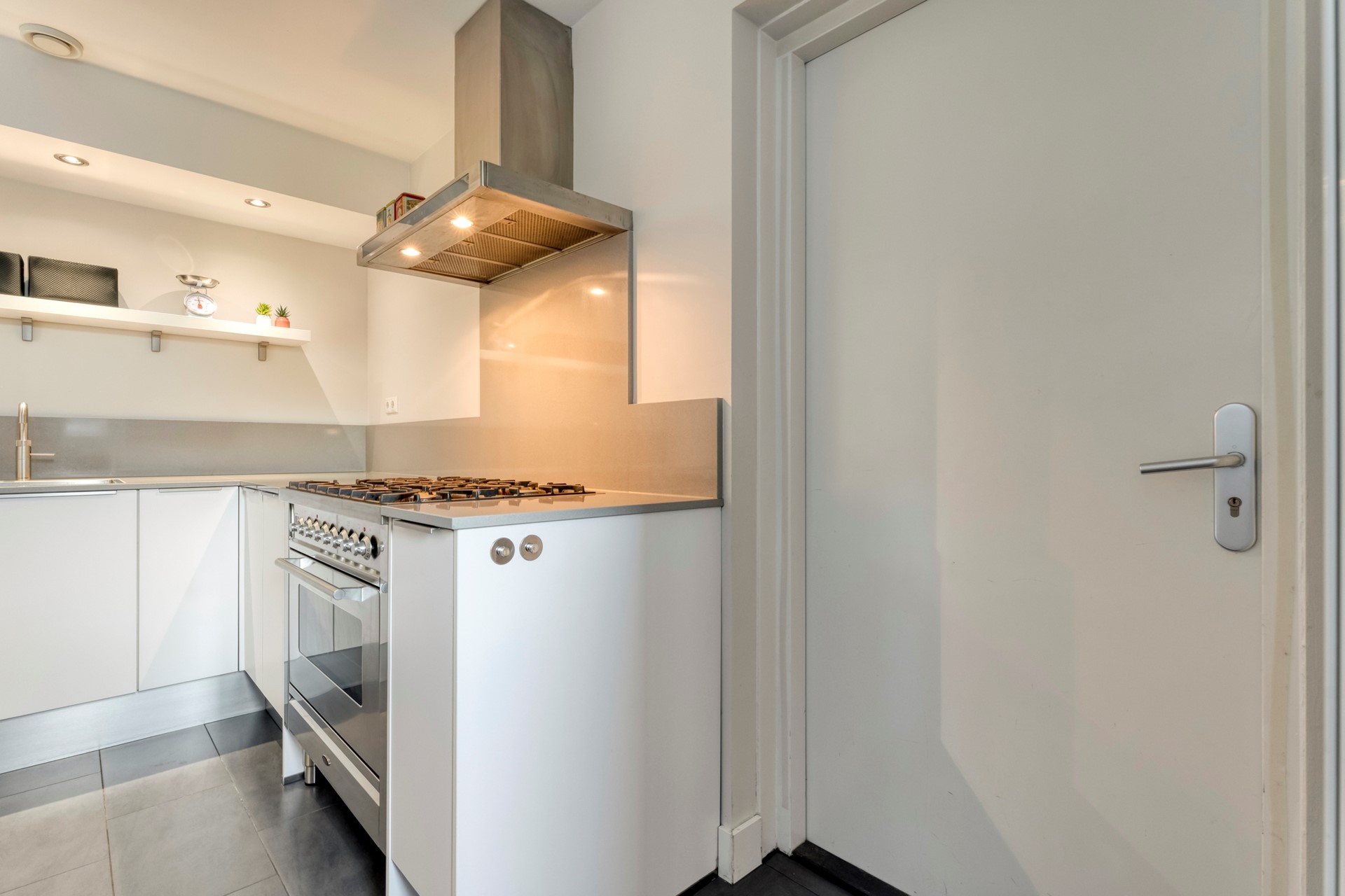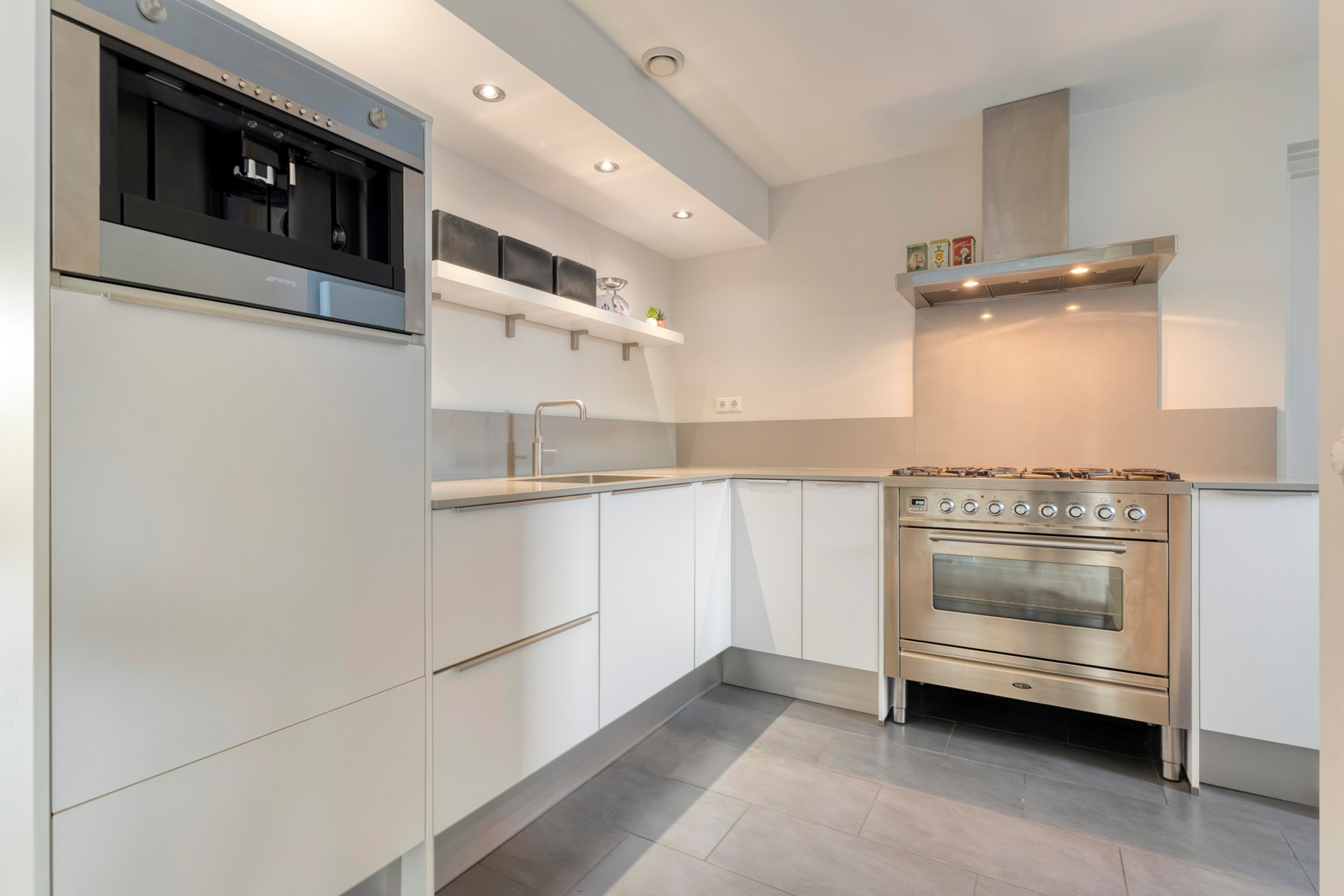 De keuken is compleet uitgevoerd met o.a. een ingebouwde koffiezetapparaat, vaatwasser, oven, koelkast, quooker, designradiator en 6-pits gaskookplaat met afzuigkap.