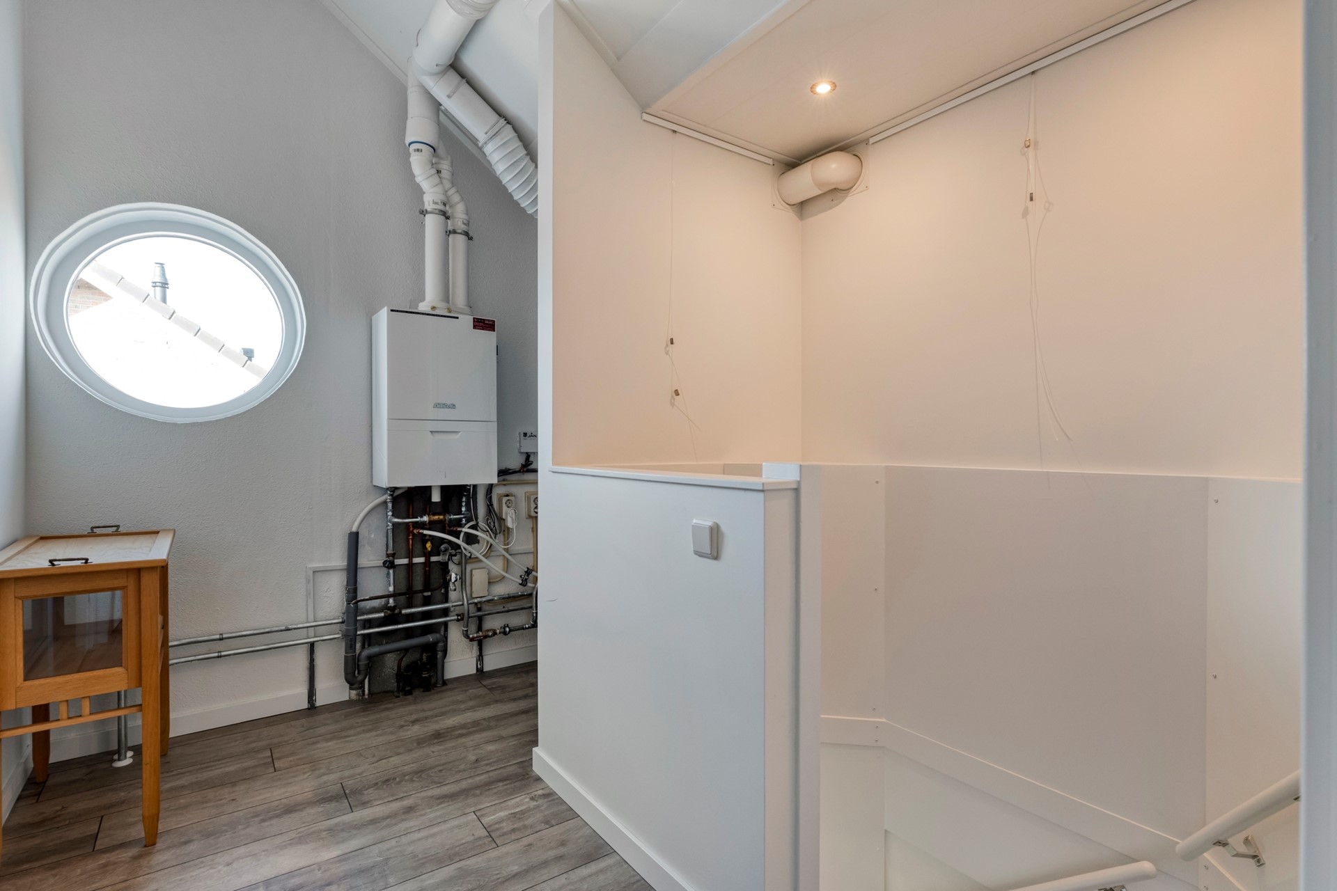 Overloop met o.a. c.v. installatie (Atag HR, 2018), hybride warmtepomp en twee slaapkamers. Eén slaapkamer heeft toegang tot de tweede badkamer welke is v.v. een douche, (hang-)toilet en wastafelmeubel.