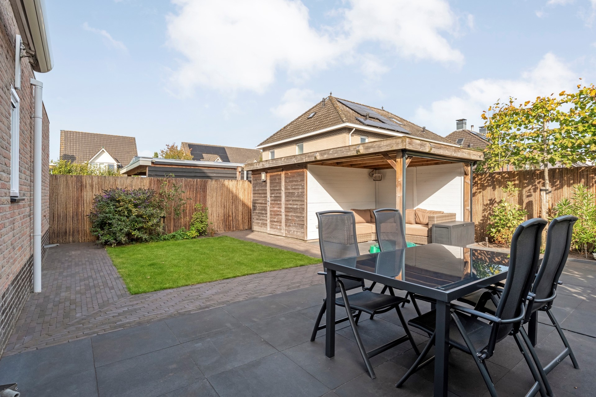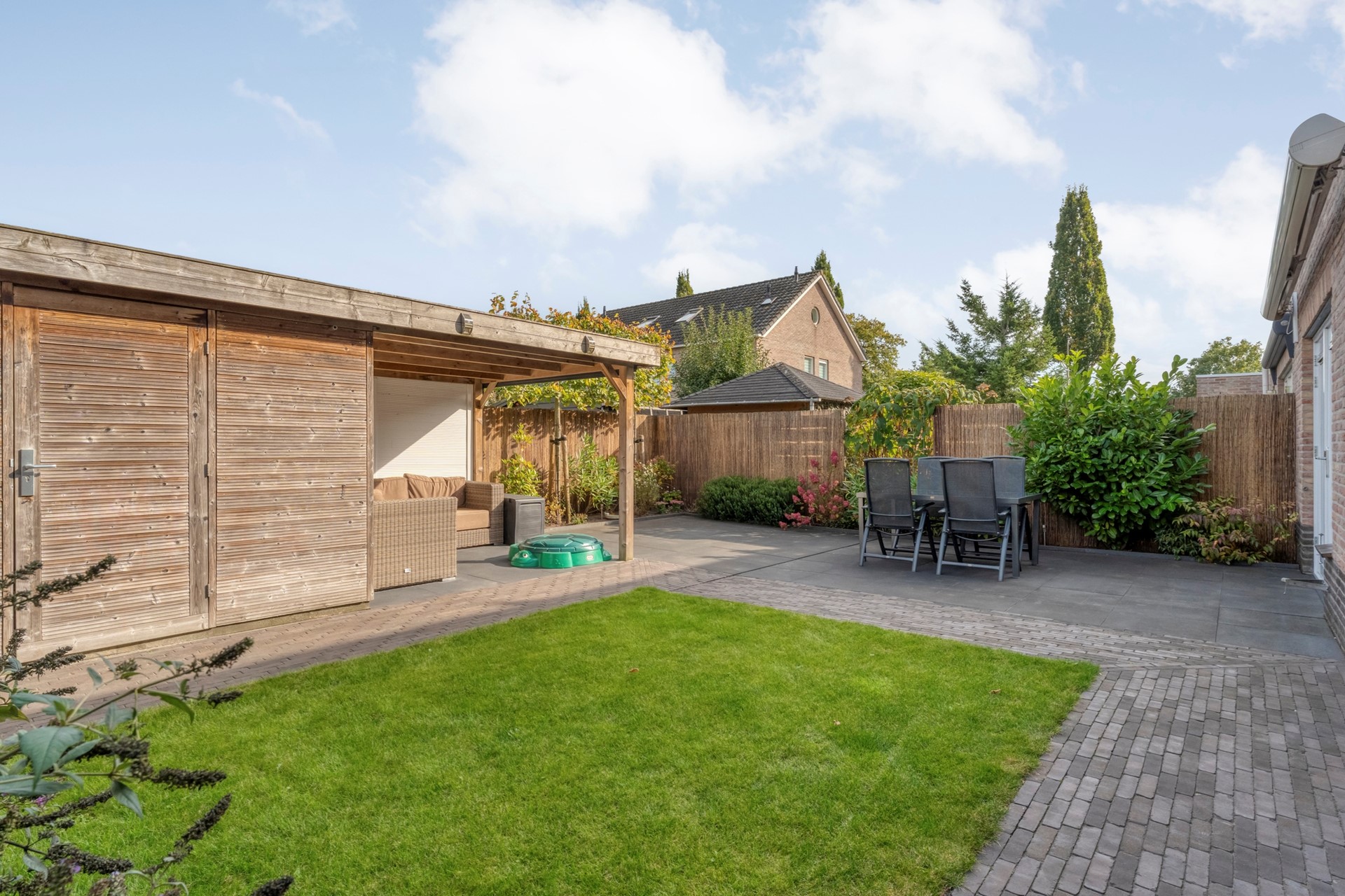 De achtertuin met meerdere terrassen, houten schuur met overkapping/veranda en achterom.