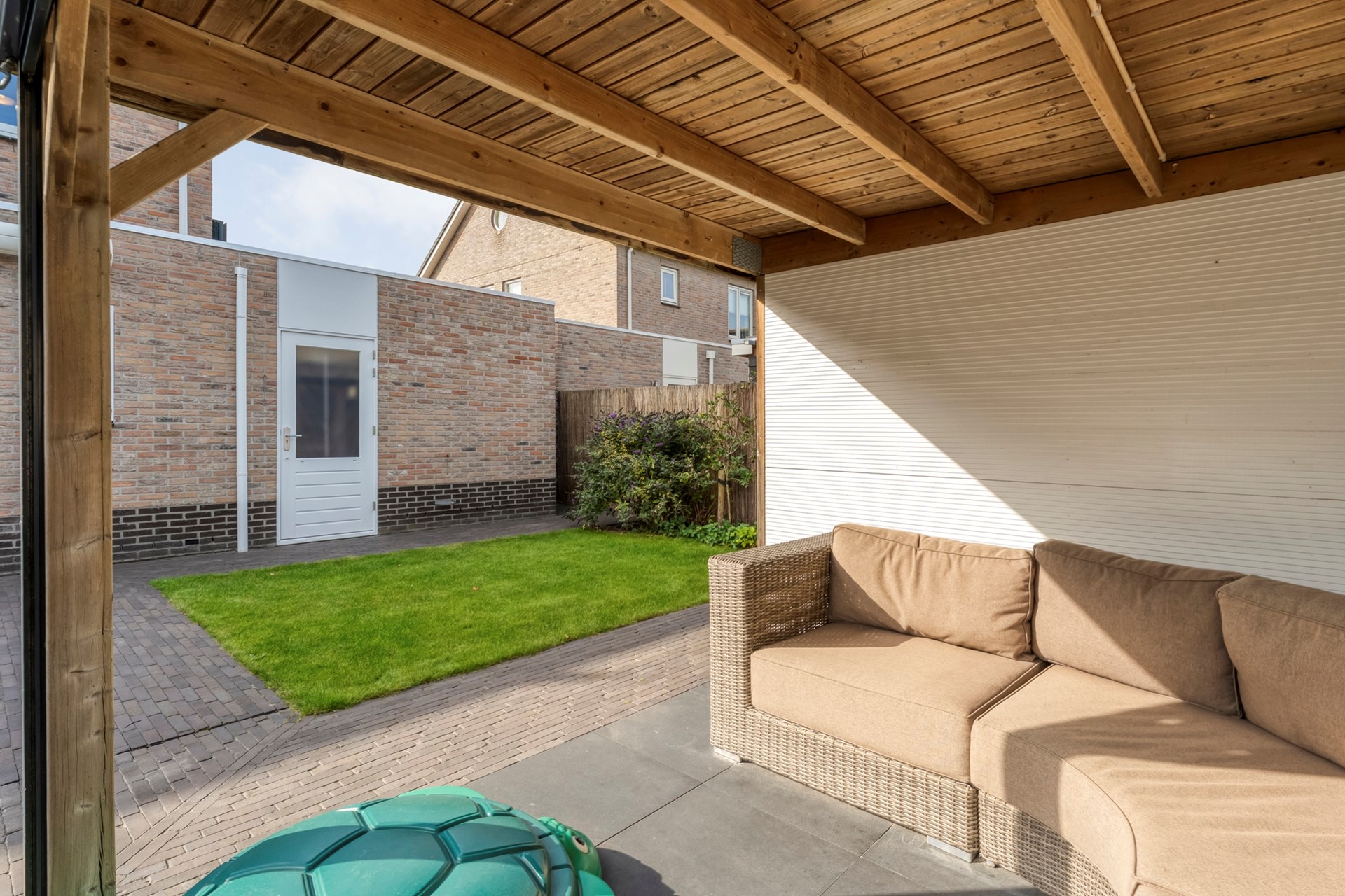 Wat een tuin! De achtertuin is zonnig, royaal en beschikt over meerdere terrassen. Of je nou in alle rust wilt ontbijten op zondagochtend, een gezellig barbecuefeestje wilt organiseren, of de kinderen wilt laten spelen – het kan hier allemaal. Achter in de tuin vind je een ruime houten schuur met veranda/overkapping. Fietsen, klusprojecten of die bank in de schaduw? Er is aan alles gedacht.