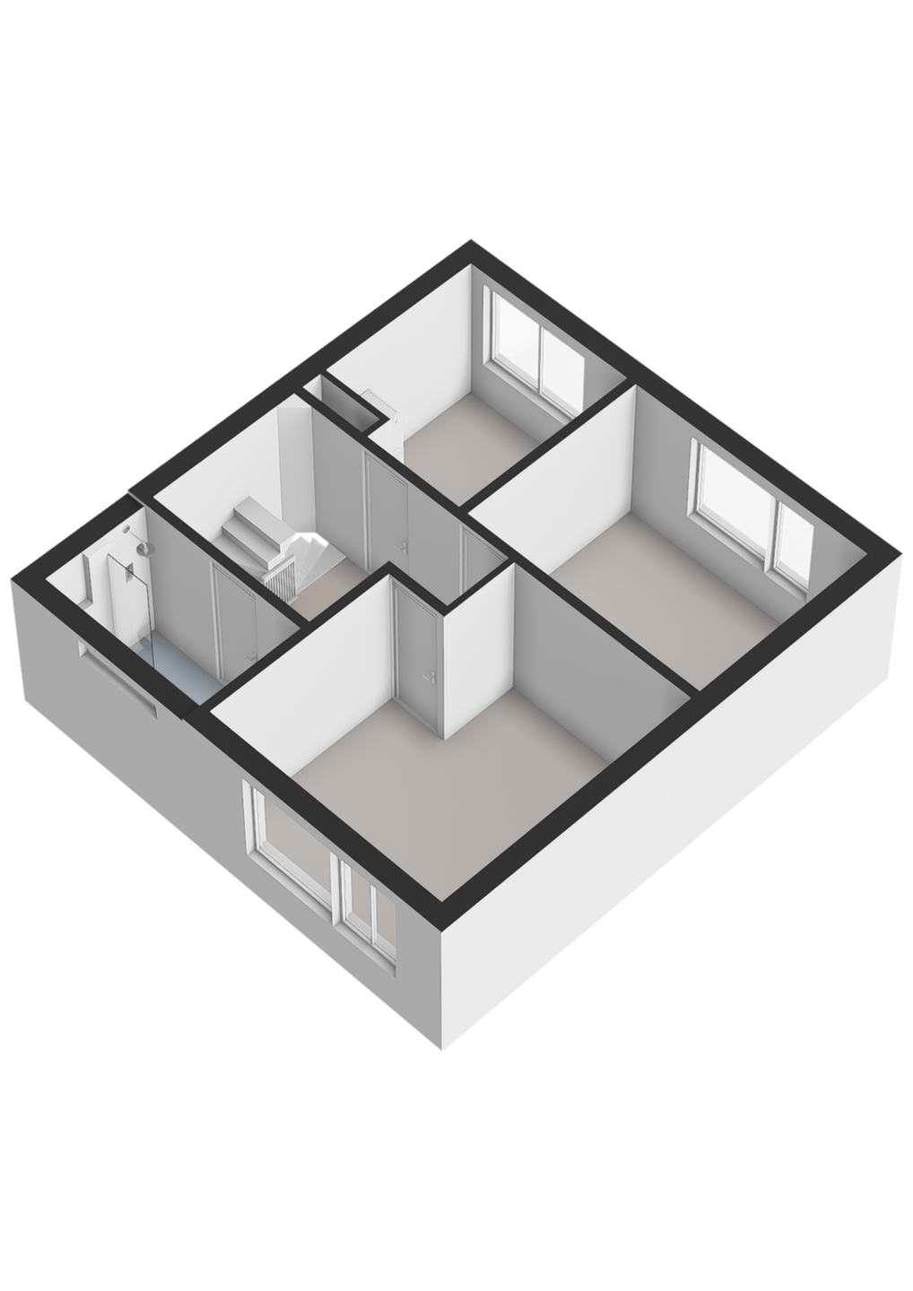 Overloop, drie slaapkamers en badkamer v.v. inloopdouche, toilet, wastafelmeubel alsook de designradiator.
