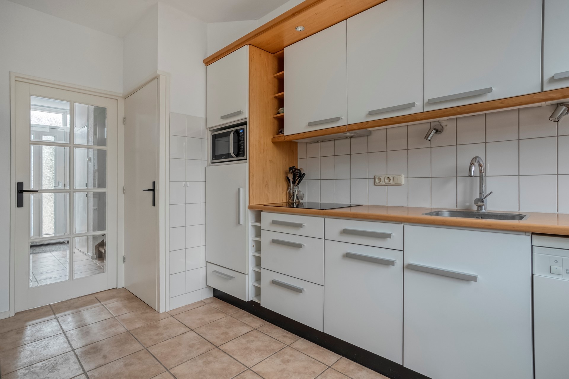 Middels entree betreedt men de hal met meterkast, toilet, trapopgang, toegang tot de keuken met verschillende inbouwapparatuur en de doorzonwoonkamer.