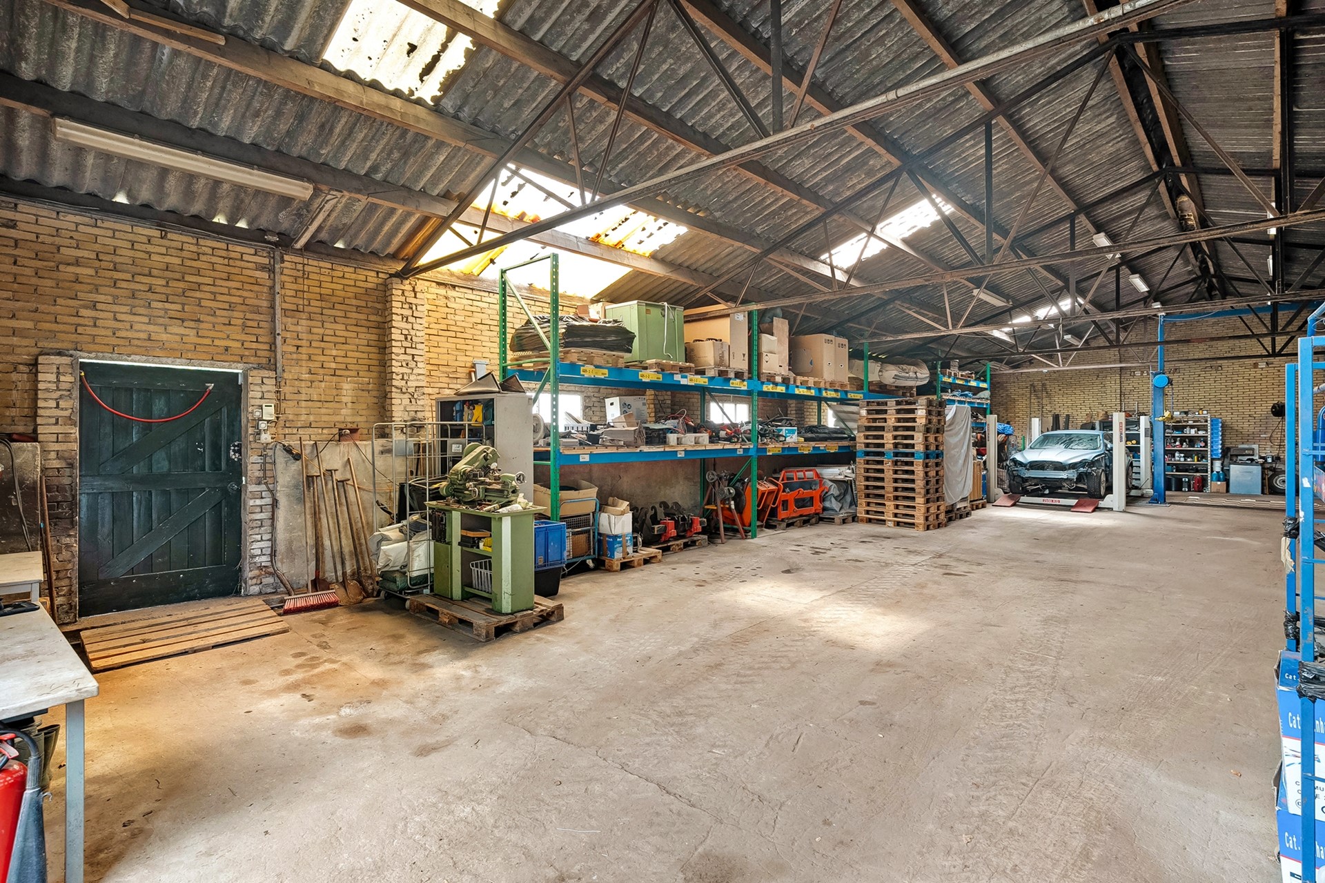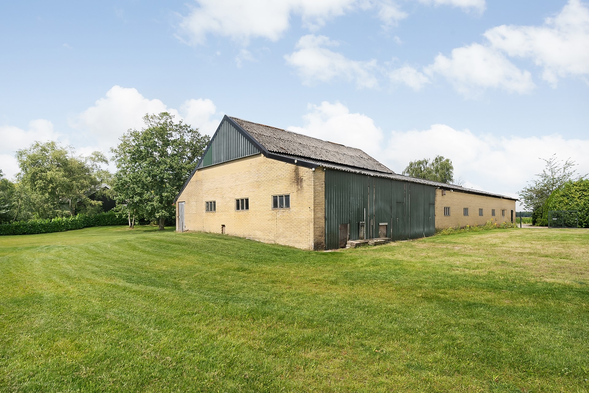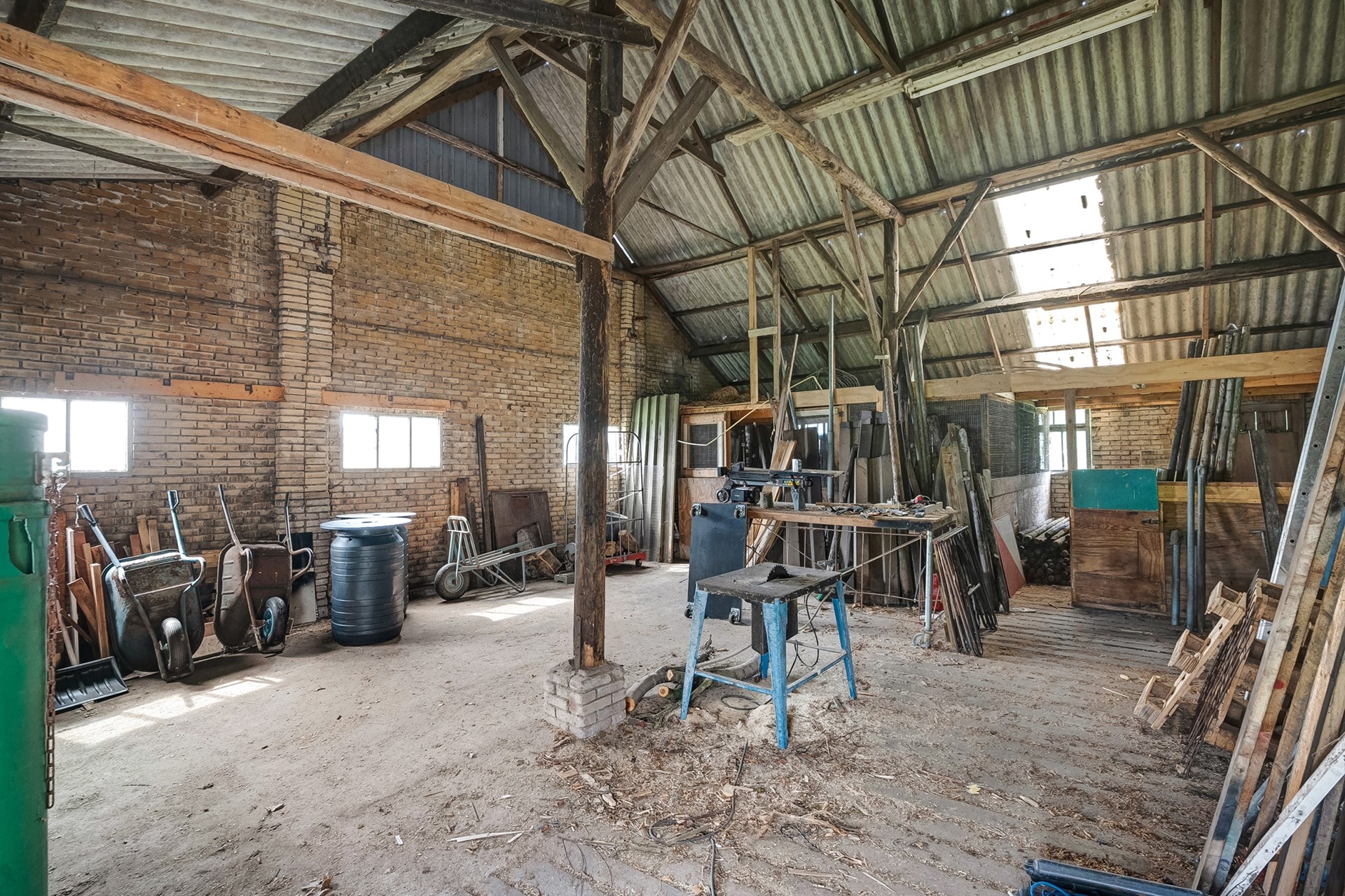 * Grote schuur, ruim 428 m2 (met asbesthoudende golfplaten).