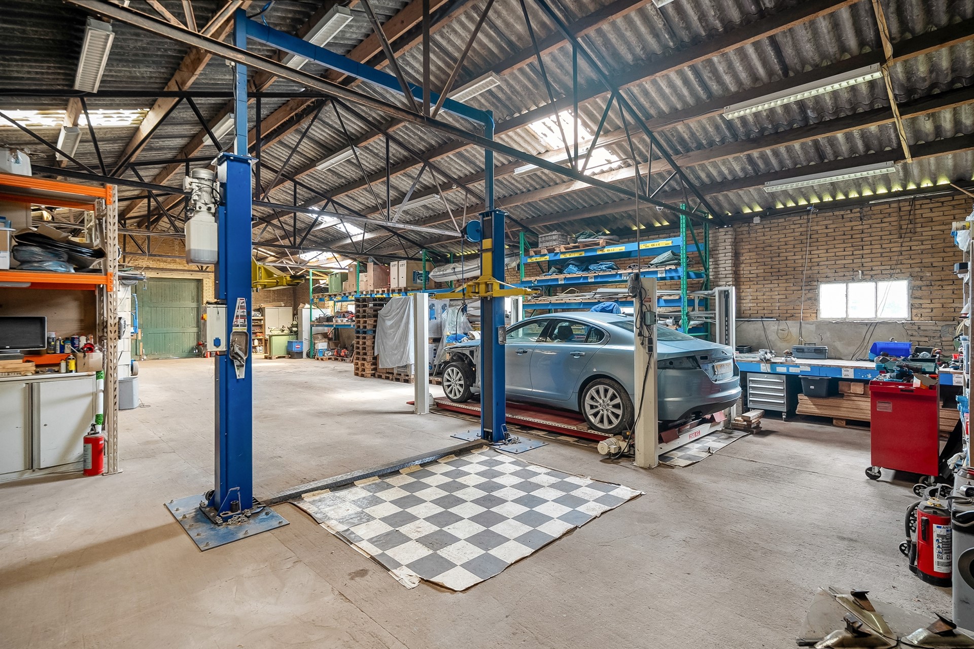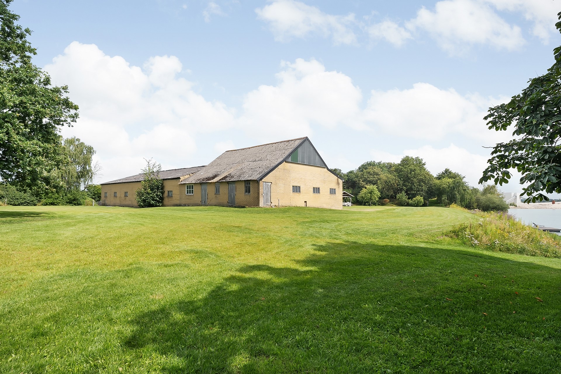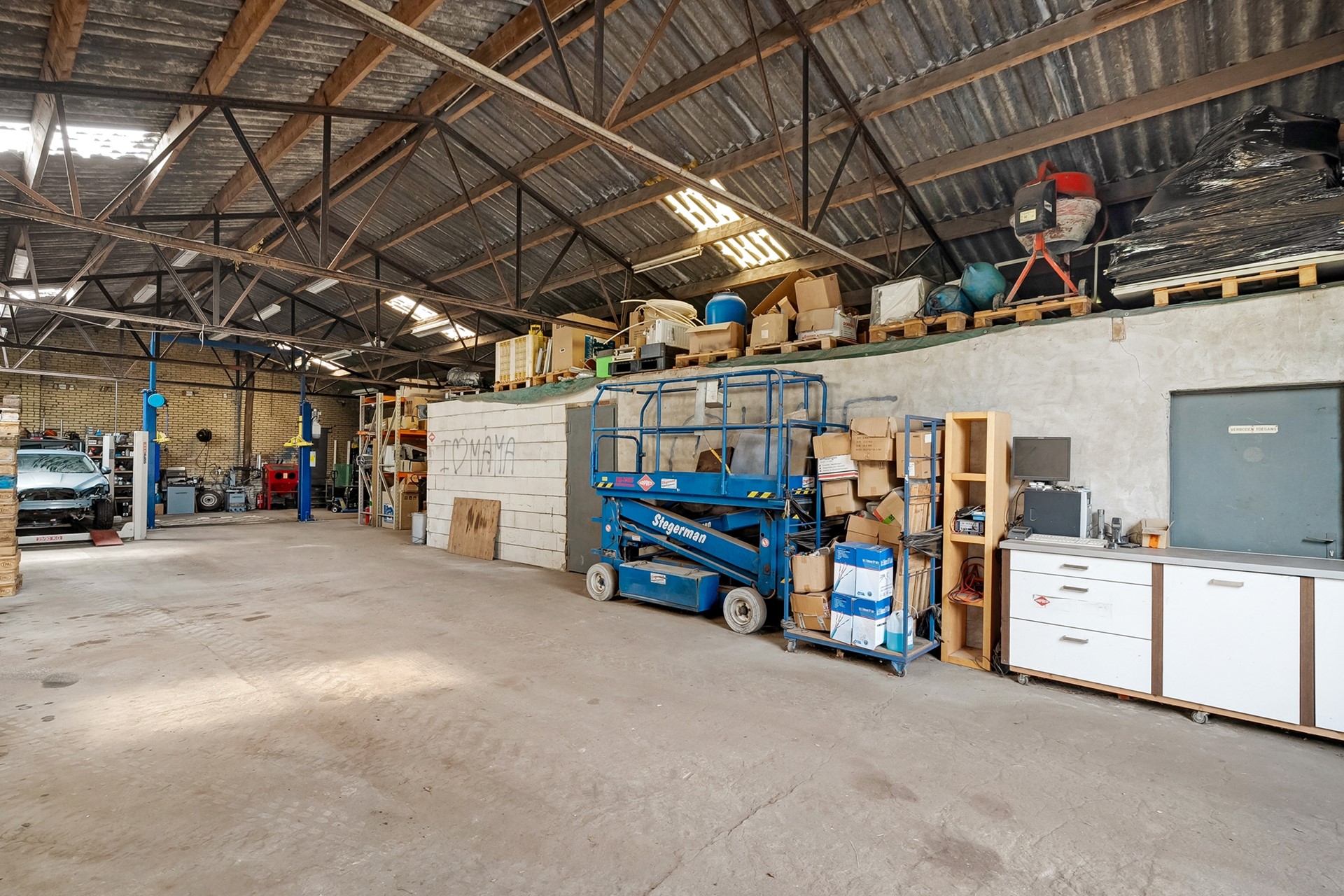 * Grote schuur, ruim 428 m2 (met asbesthoudende golfplaten).