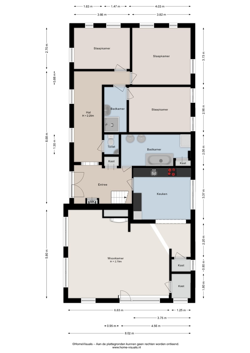 De hal geeft eveneens toegang tot o.a. een eerste badkamer en het achterhuis welke is voorzien van toilet met fonteintje, drie slaap-/ werkkamers (voormalig B & B) en tweede badkamer v.v. douche en wastafelmeubel.