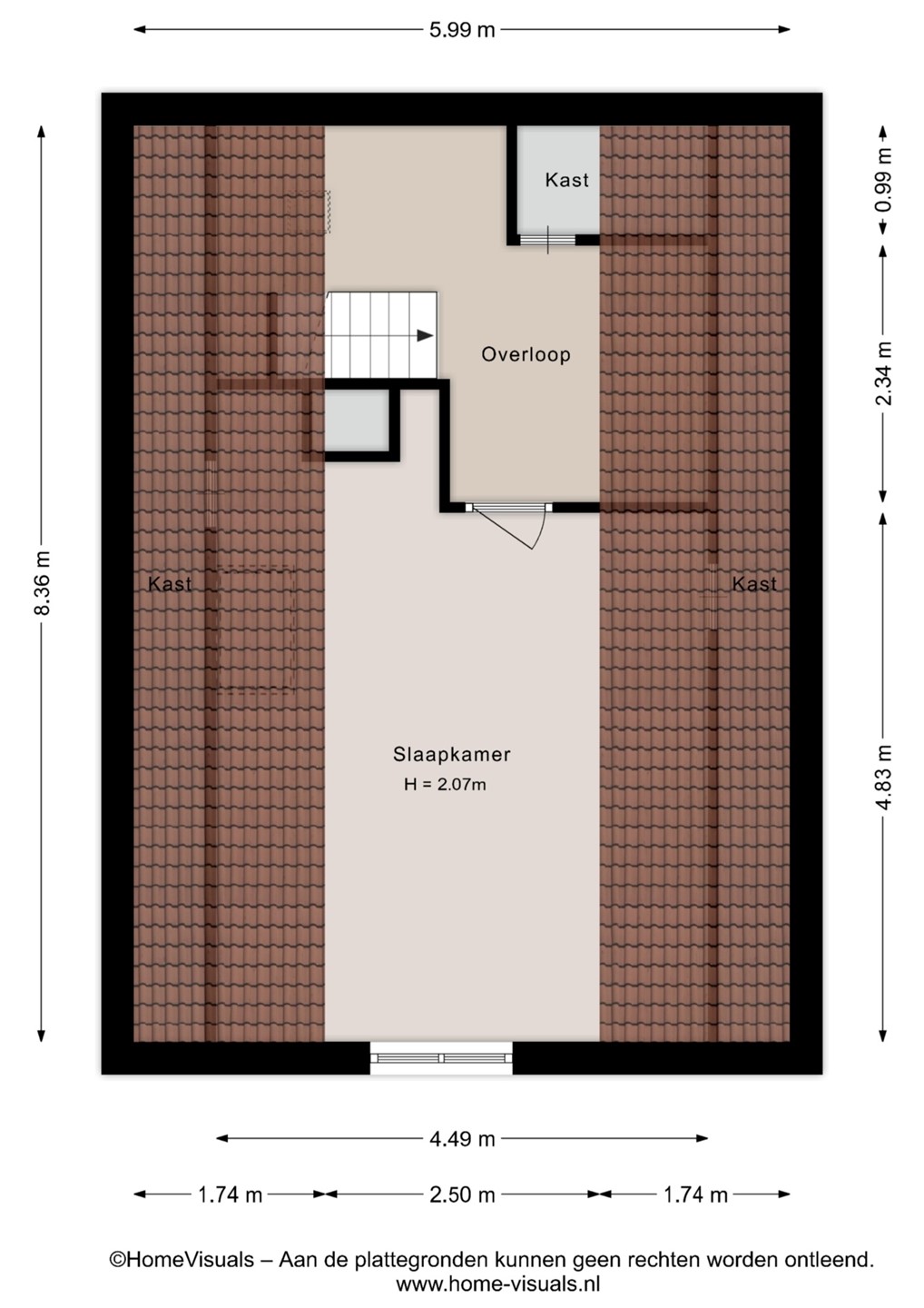 Overloop met stookhok (Bosch HR, 2011), één slaapkamer met knieschotten en grote zolderruimte.