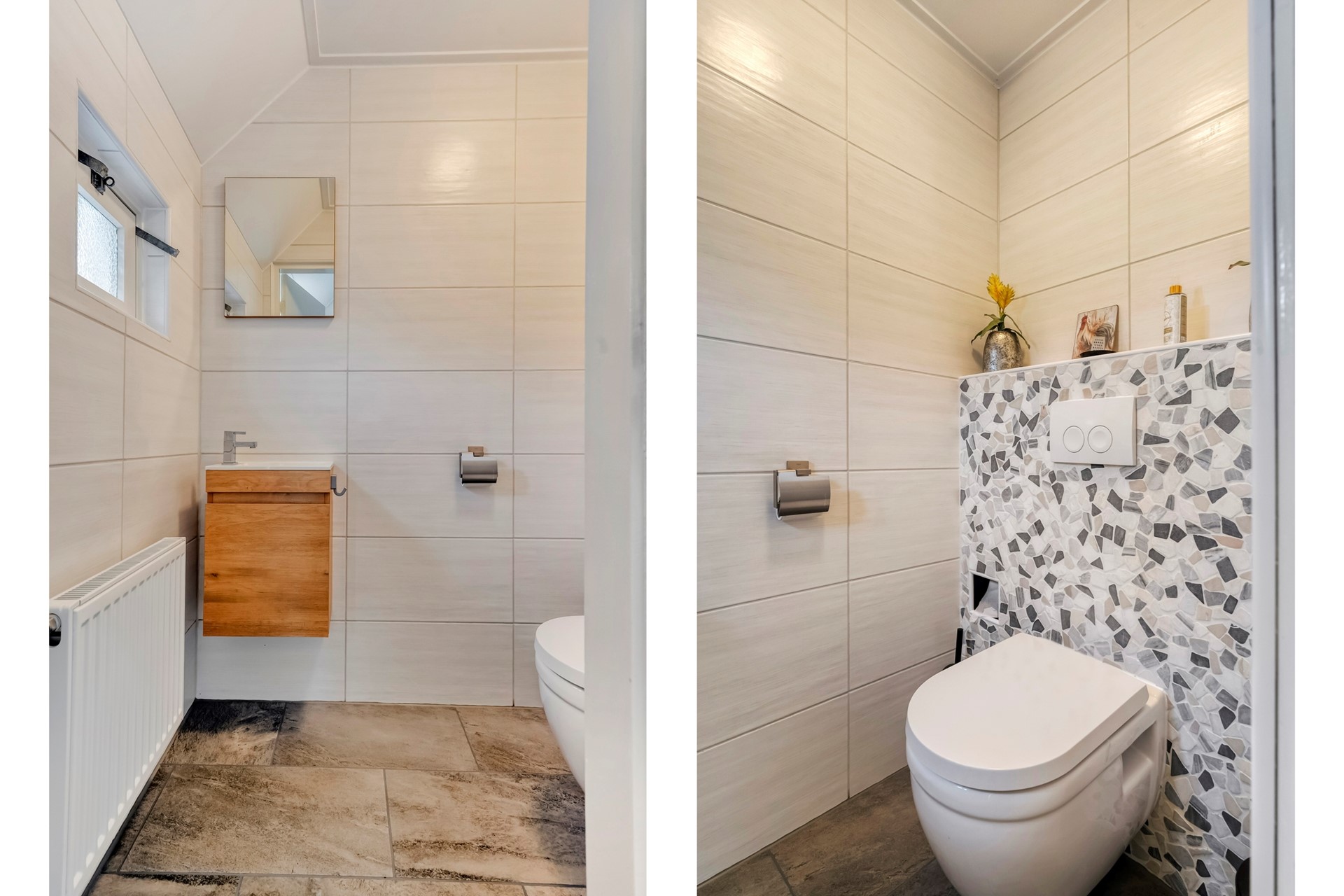 Je komt binnen via de ruime hal/entree, meteen links een handige inloopkast om jassen en schoenen uit het zicht te houden. In de hal vind je het eerste toilet met fonteintje. En stel je voor: een slaapkamer op de begane grond, ideaal voor als je graag alles gelijkvloers hebt, óf voor slapen en logeren met gasten die blijven plakken na een gezellige avond.