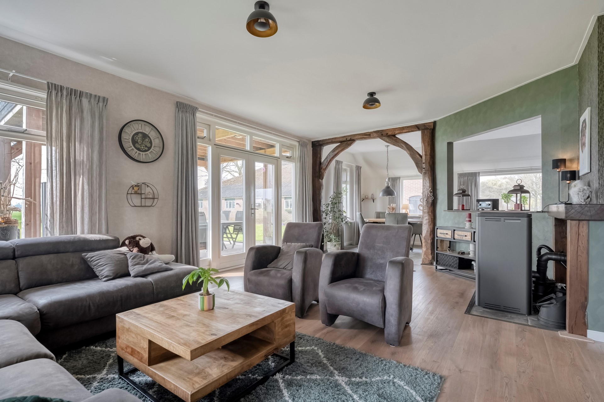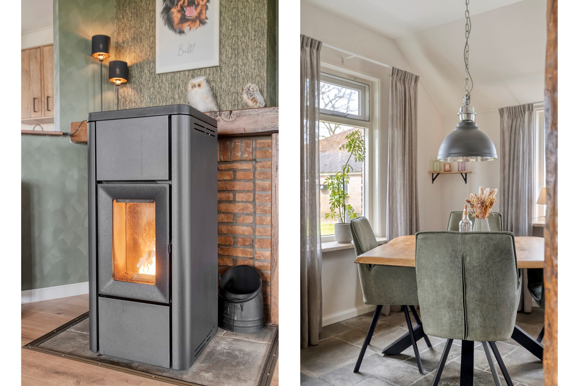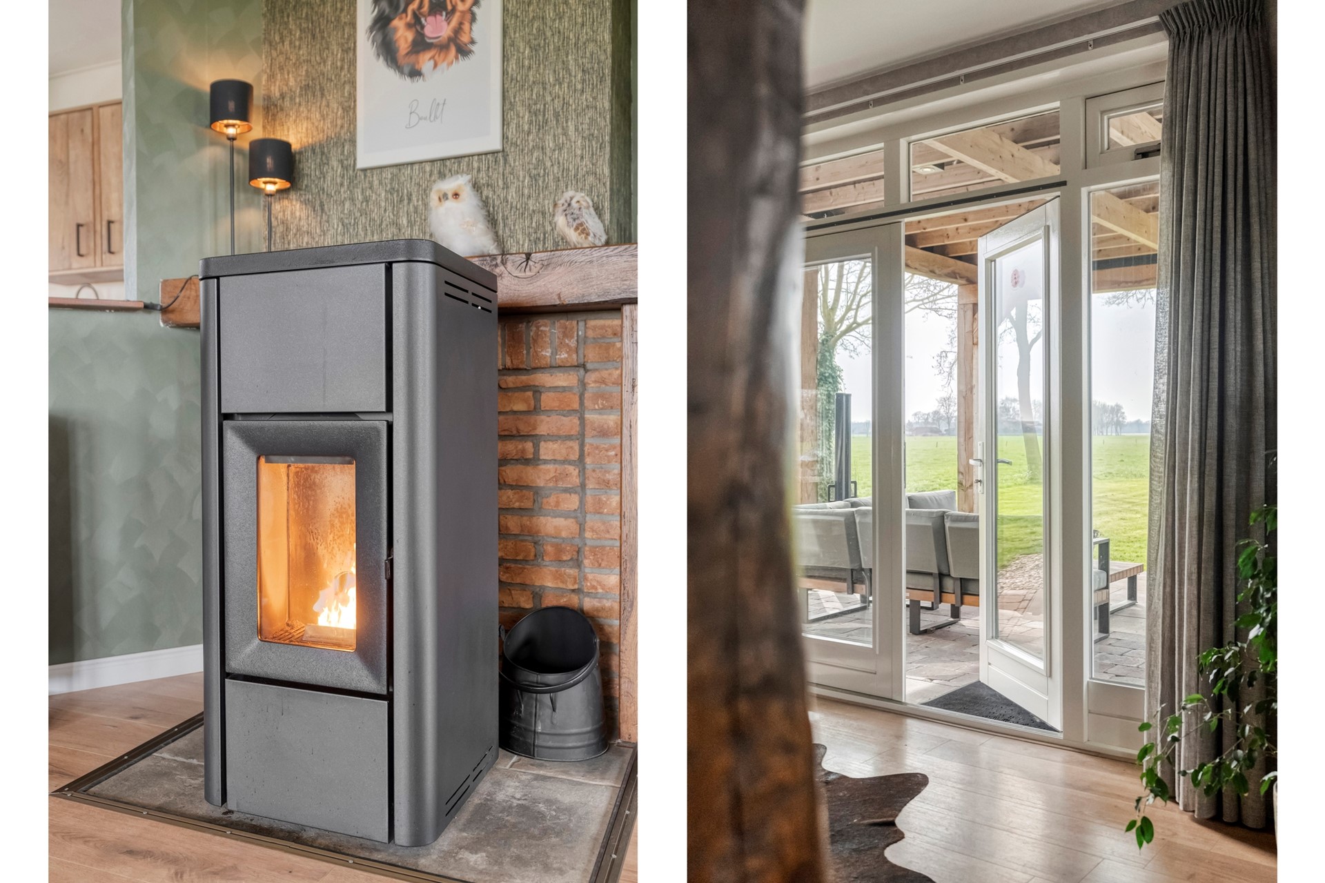 Een tussenhal, uitgerust met meterkast, leidt je naar de sfeervolle woonkamer met pelletkachel en openslaande tuindeuren. Zie je jezelf al zitten, een glas wijn in de hand, de deuren wagenwijd open naar de overkapping/veranda? Het buitenleven hangt hier letterlijk naadloos samen met binnen.