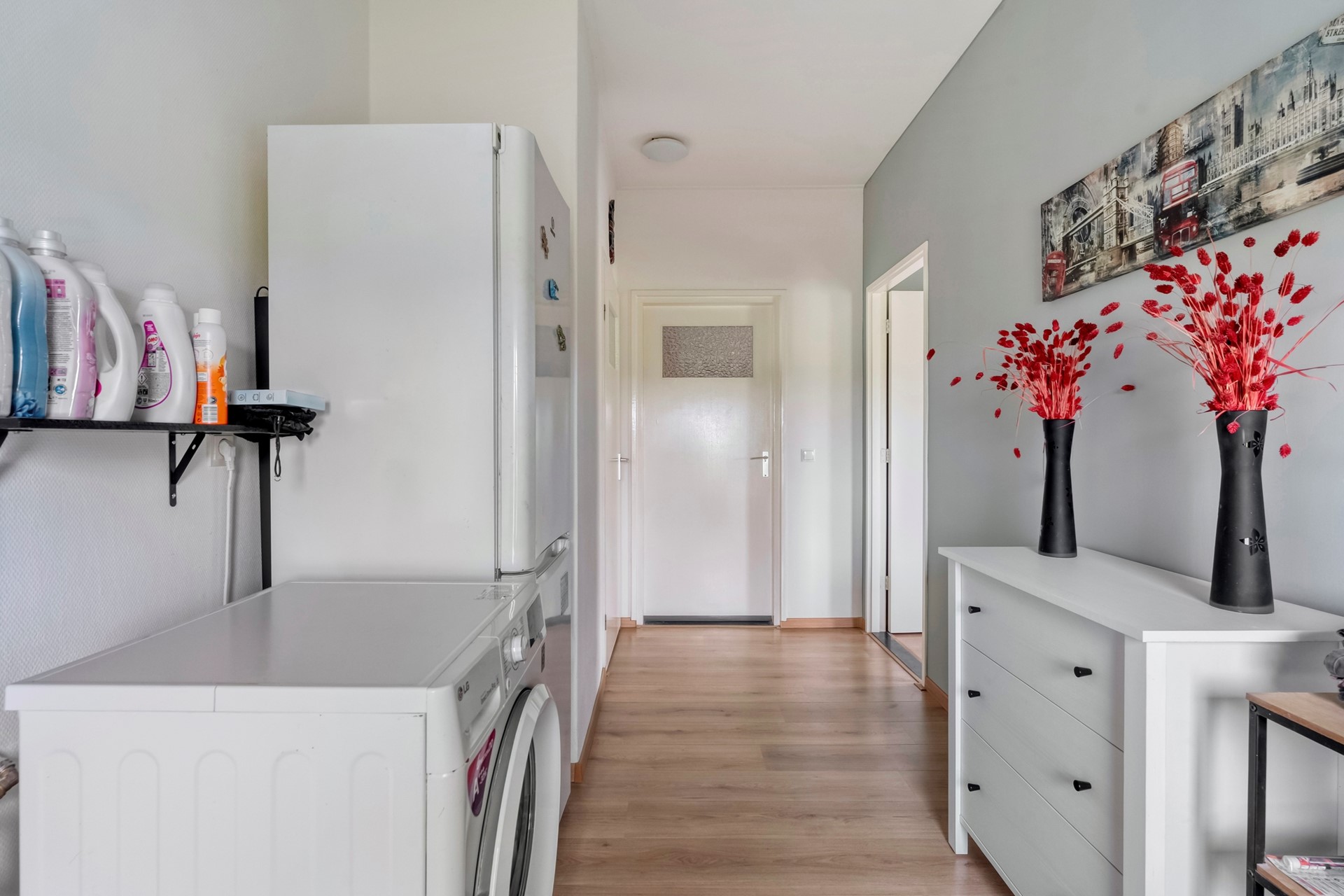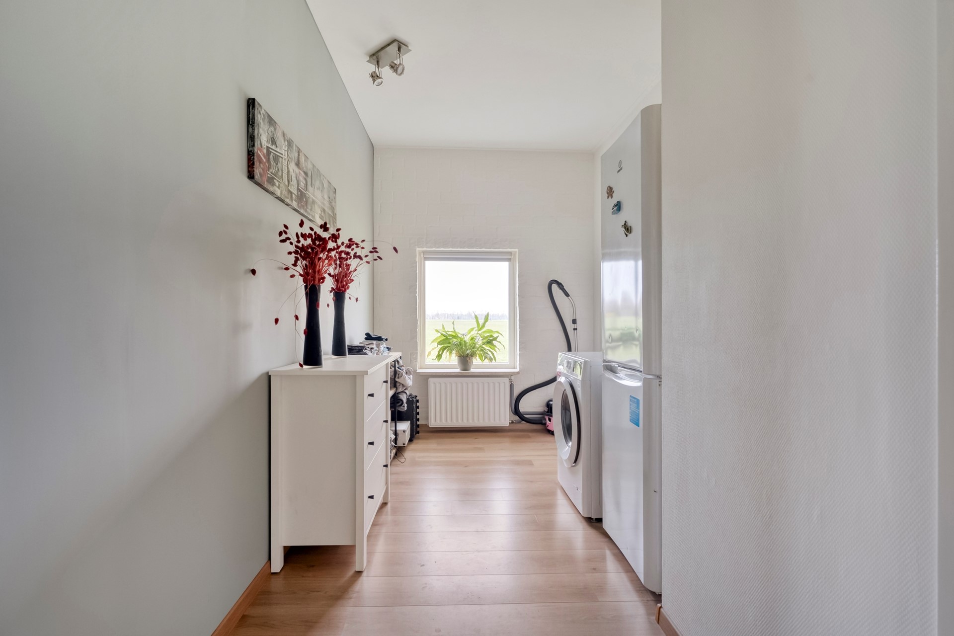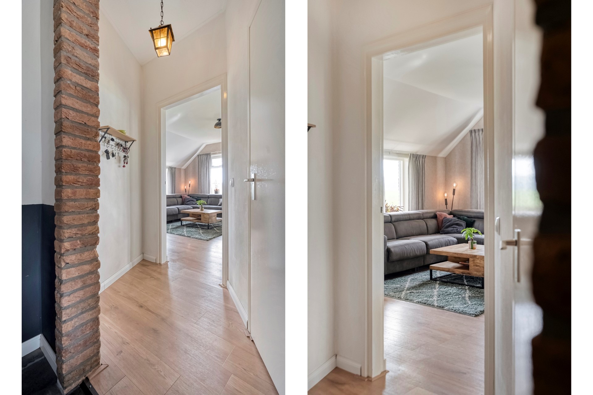 Een tussenhal, uitgerust met meterkast, leidt je naar de sfeervolle woonkamer met pelletkachel en openslaande tuindeuren. Zie je jezelf al zitten, een glas wijn in de hand, de deuren wagenwijd open naar de overkapping/veranda? Het buitenleven hangt hier letterlijk naadloos samen met binnen.